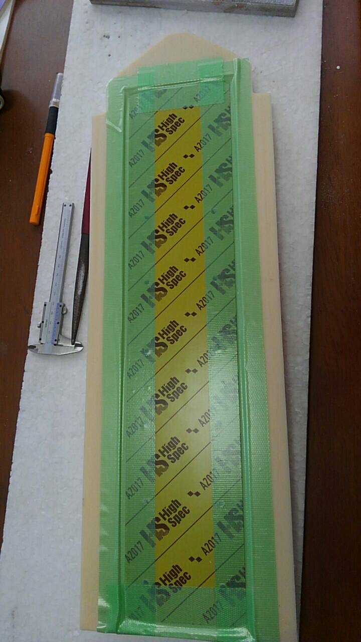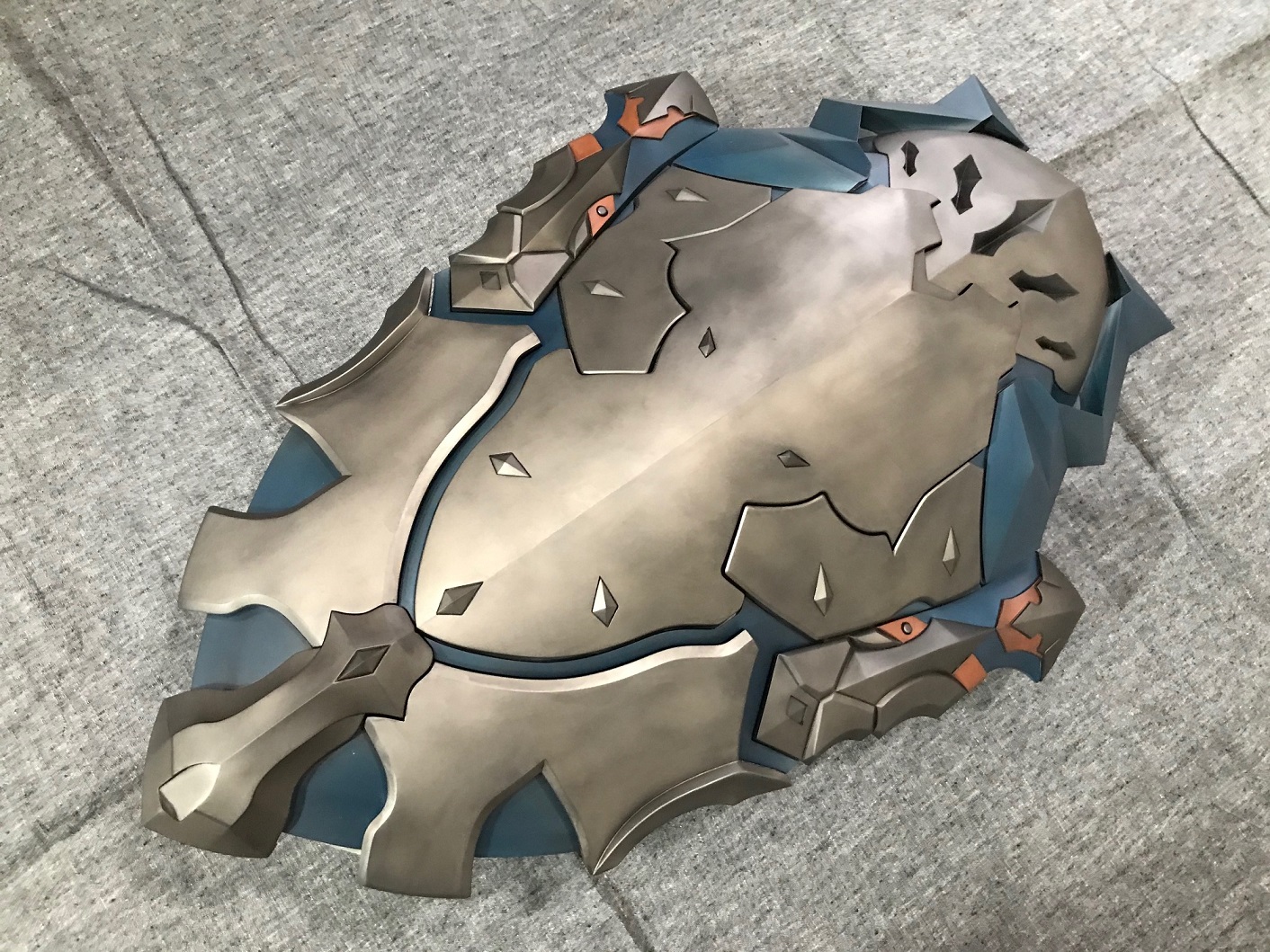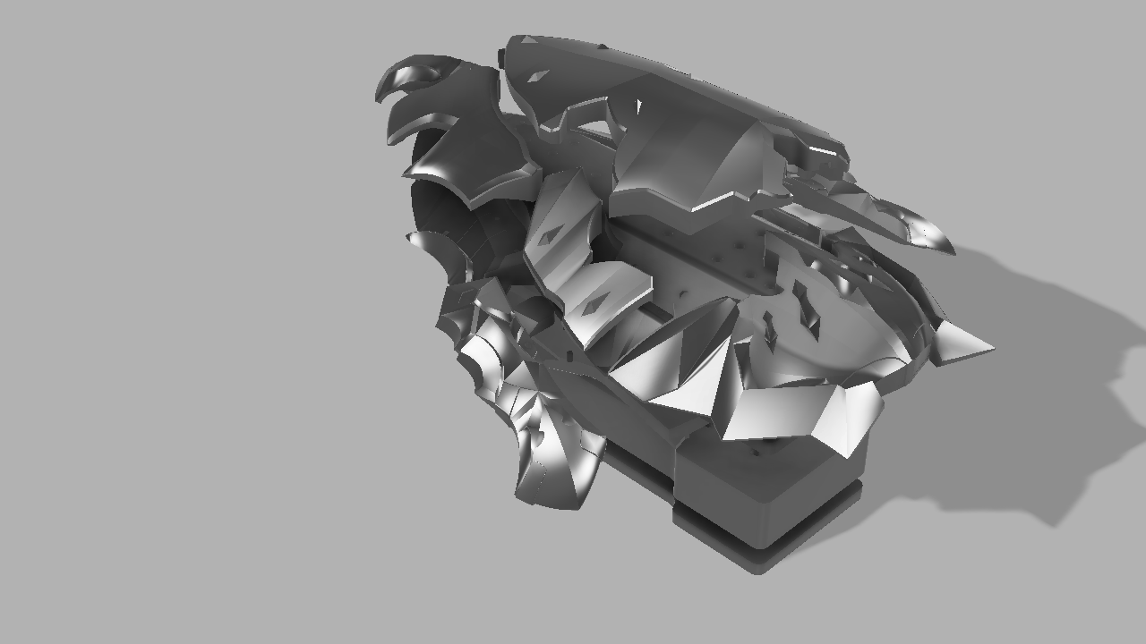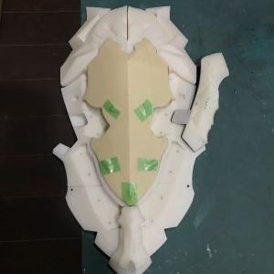 盾の重量が10Kg以上になることを予測し、斜め置きの展示にも耐えられるよう、まず盾の裏面とケースを固定する為のパーツ作成から開始しました。 盾のベースになるパーツを切削、盾のベースパーツの裏面に金属板を配置しています。