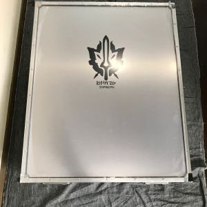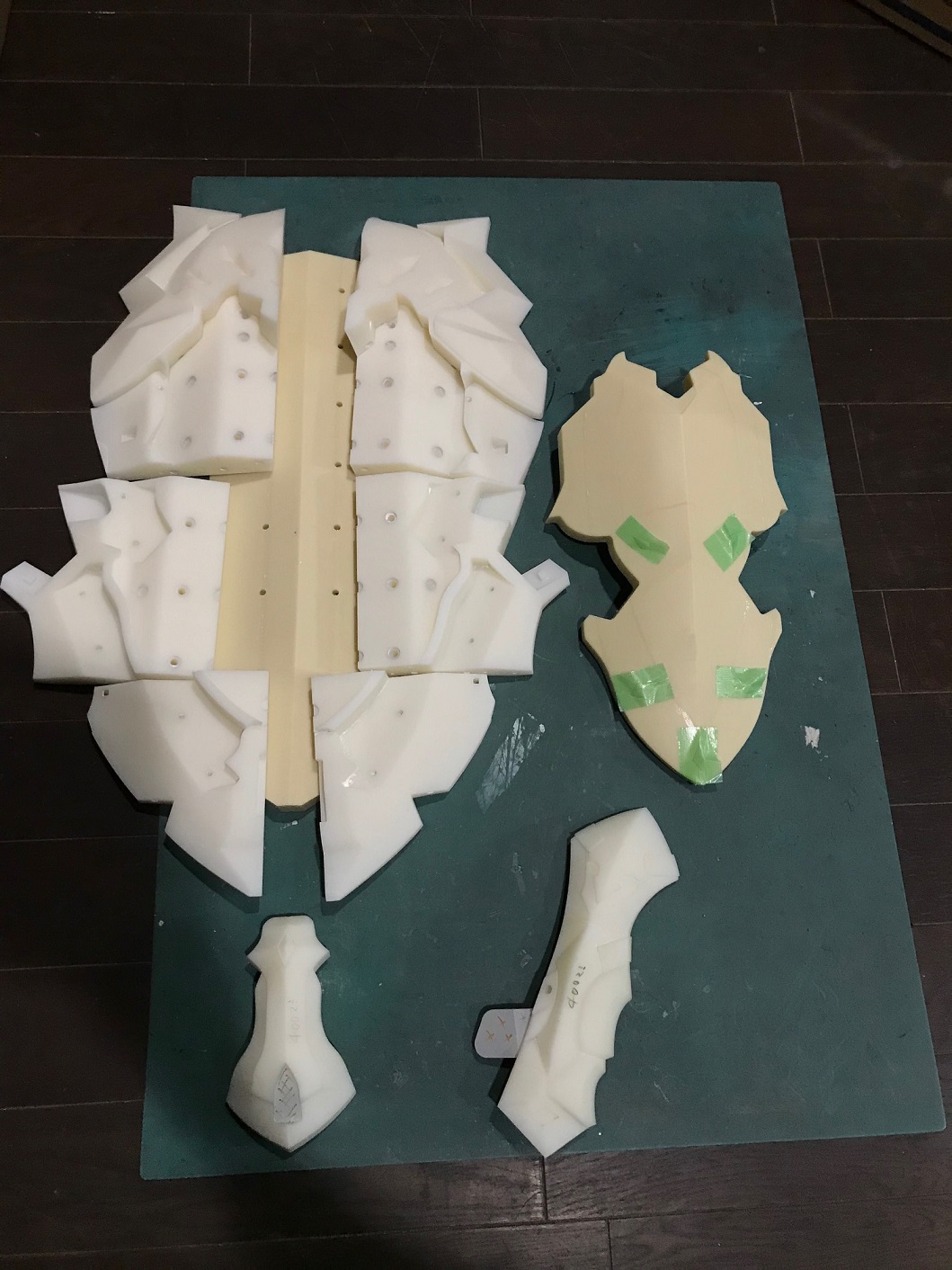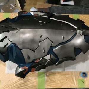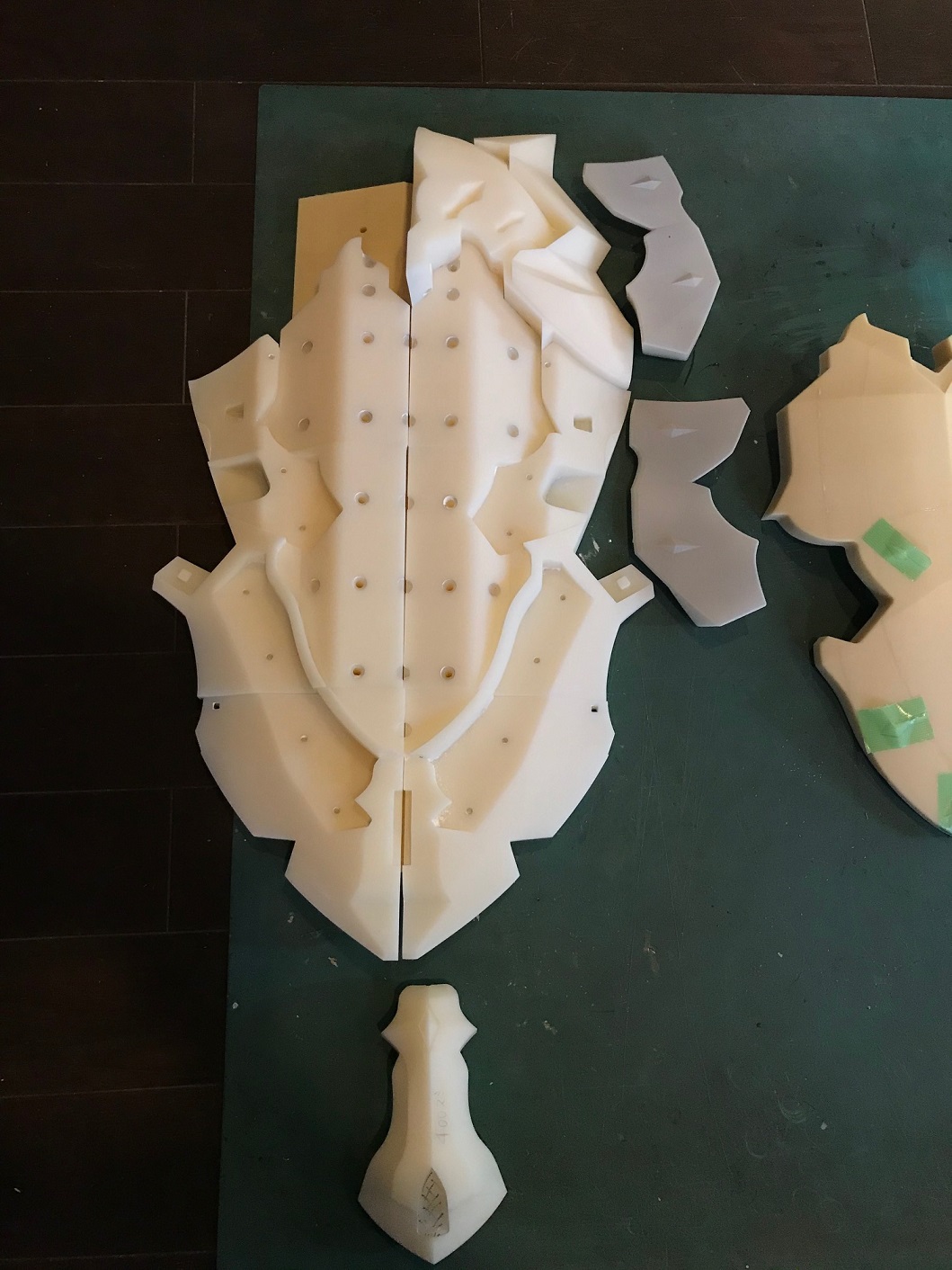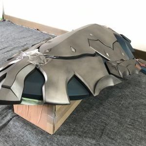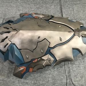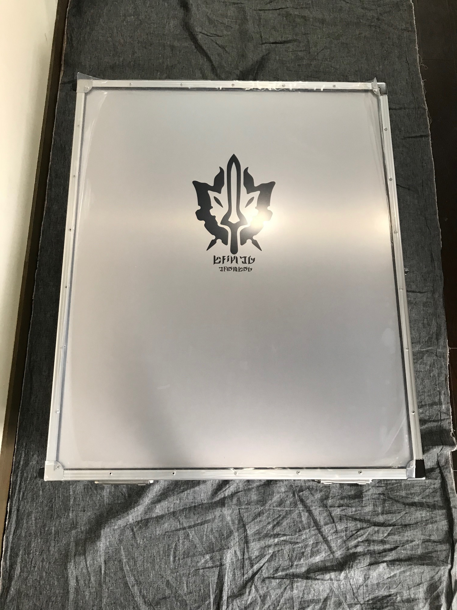 盾の重量が10Kg以上になることを予測し、斜め置きの展示にも耐えられるよう、まず盾の裏面とケースを固定する為のパーツ作成から開始しました。 盾のベースになるパーツを切削、盾のベースパーツの裏面に金属板を配置しています。