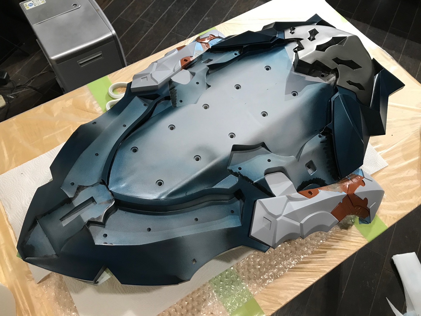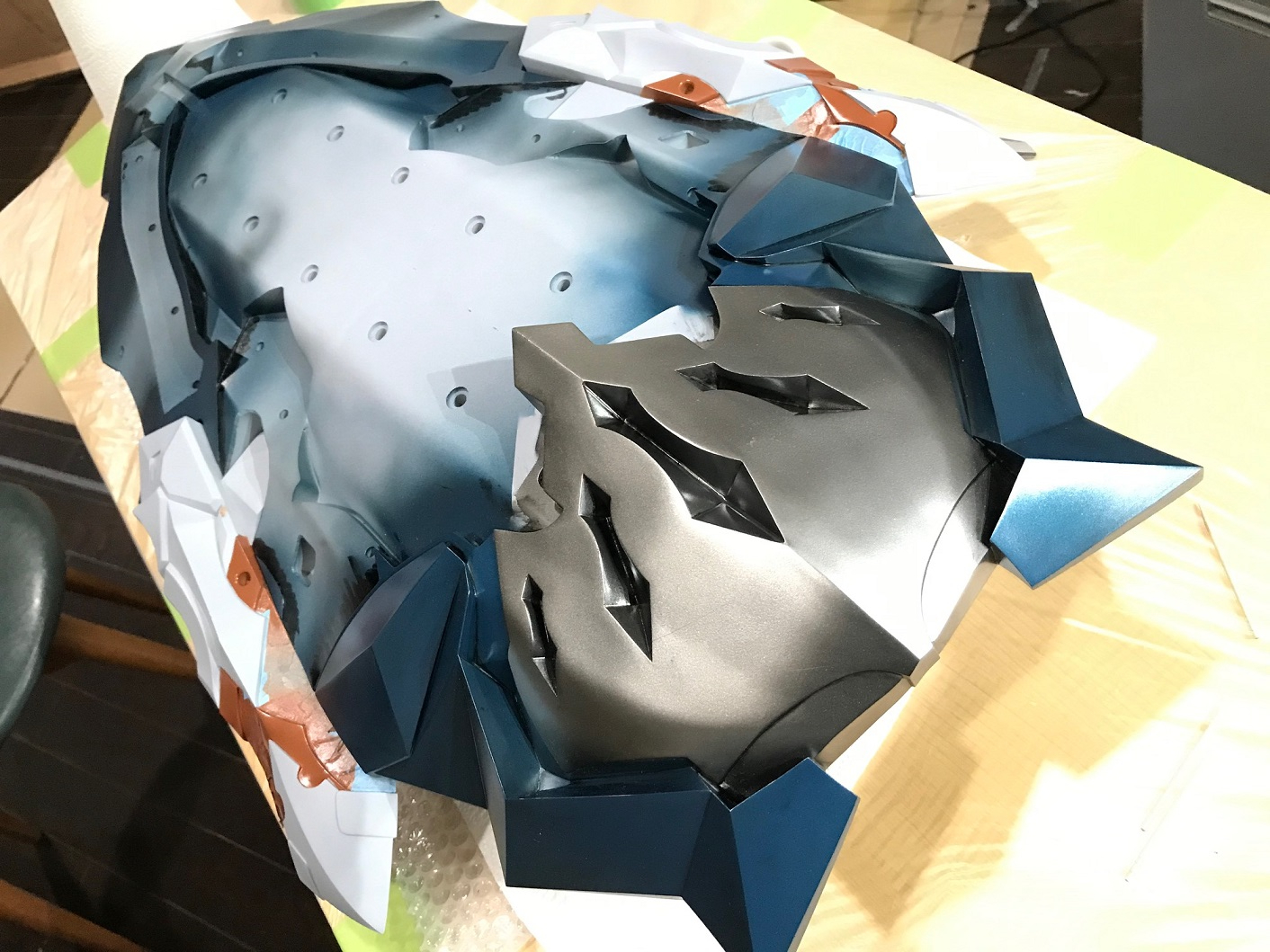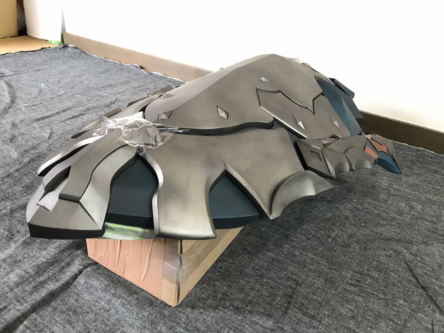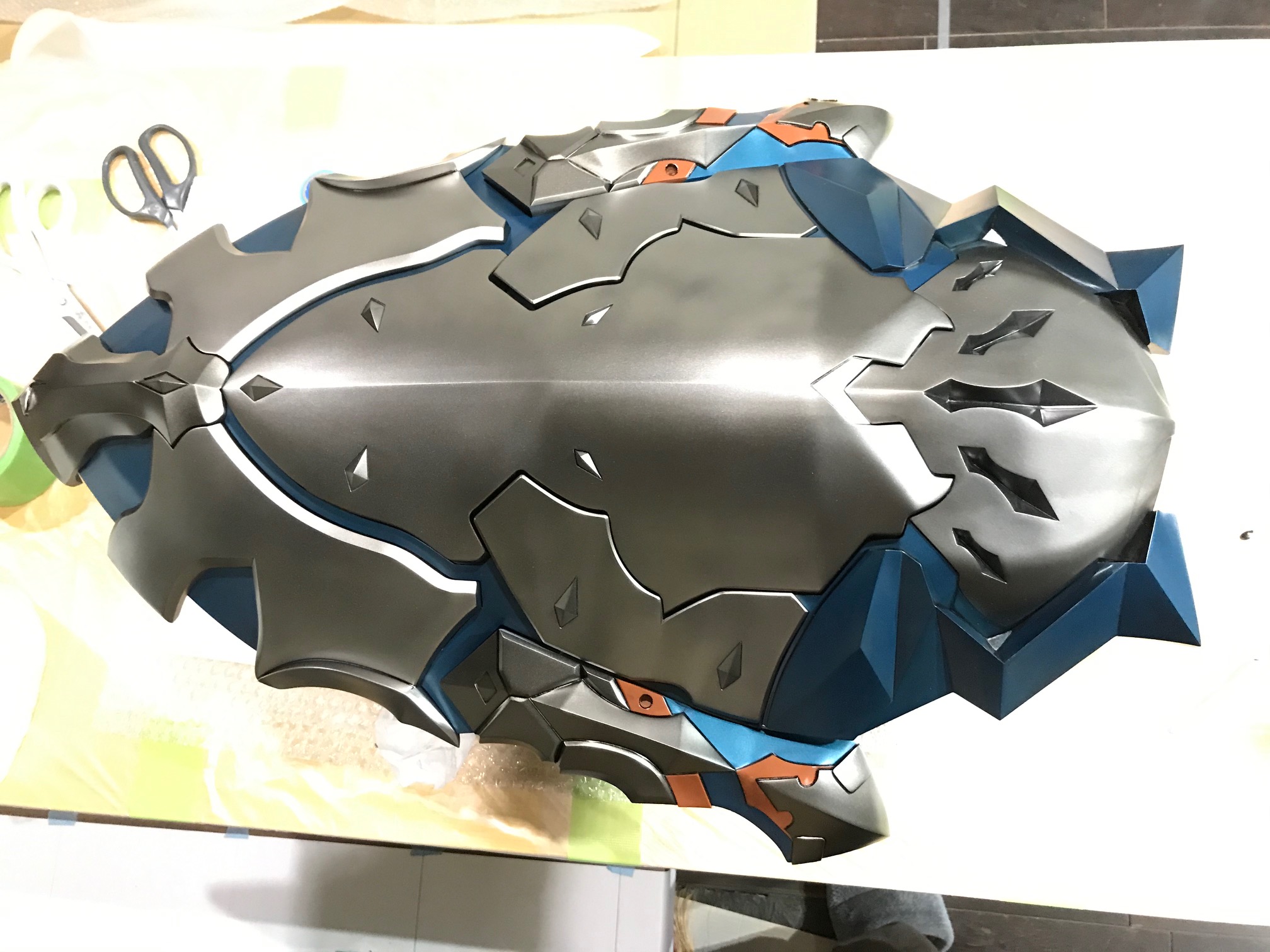 納得がいったところで塗装終了、各パーツの接着を開始します。 盾の真正面にくるパーツは盾をケースに収納し、本体をボルトで固定した後に被せて接着します。