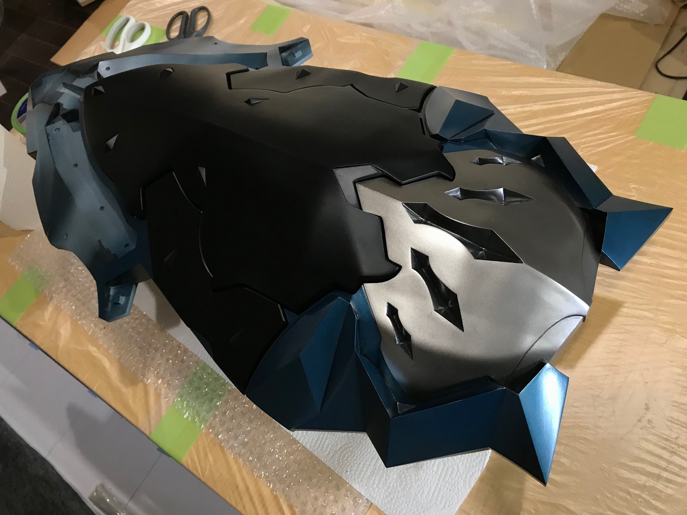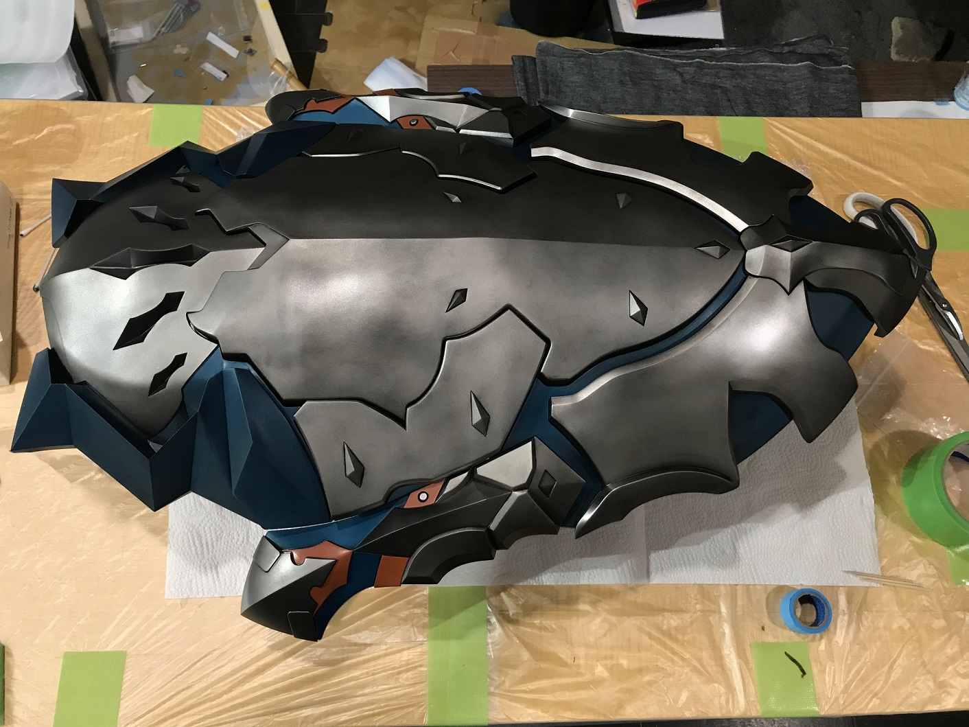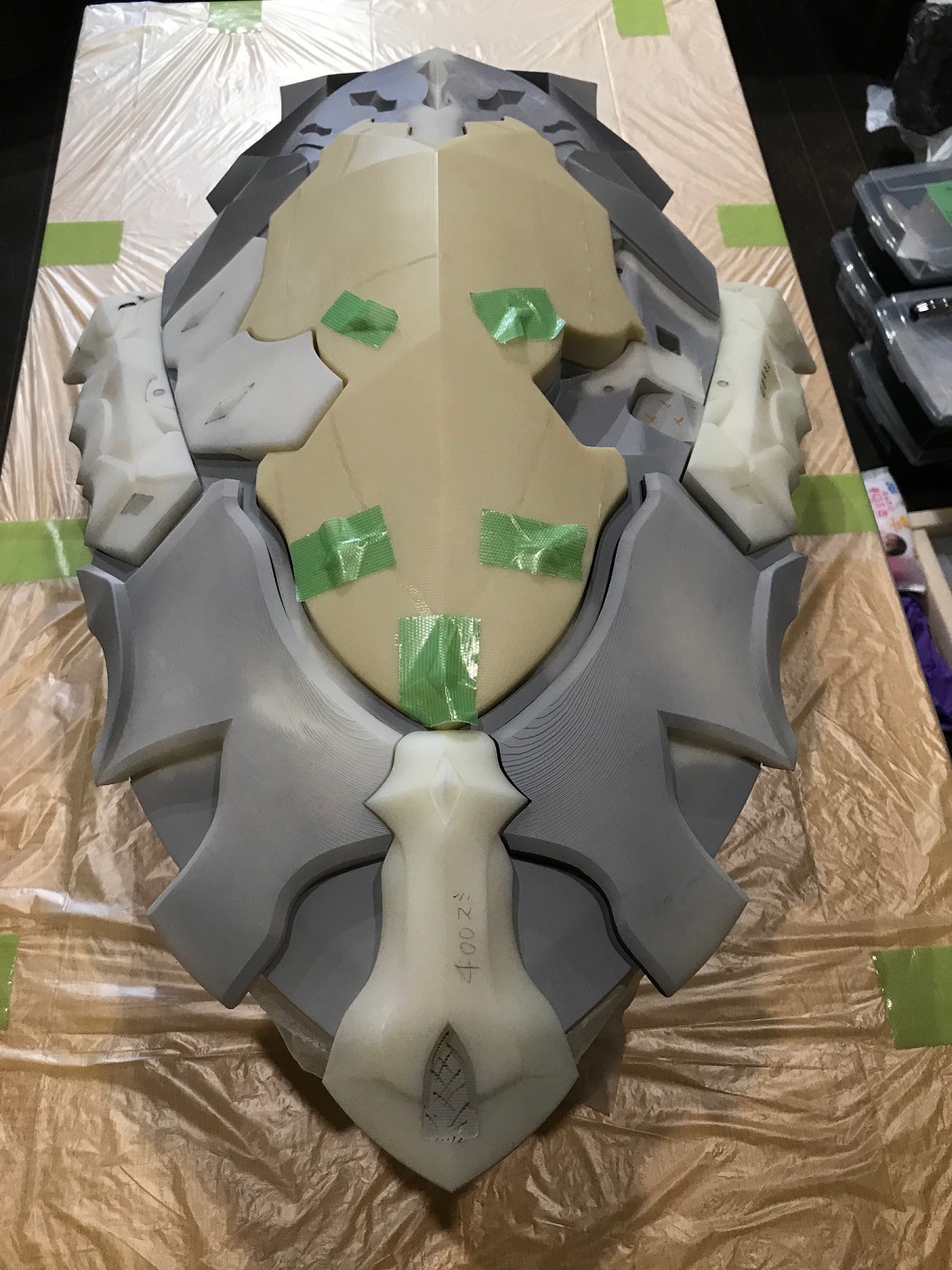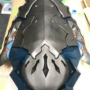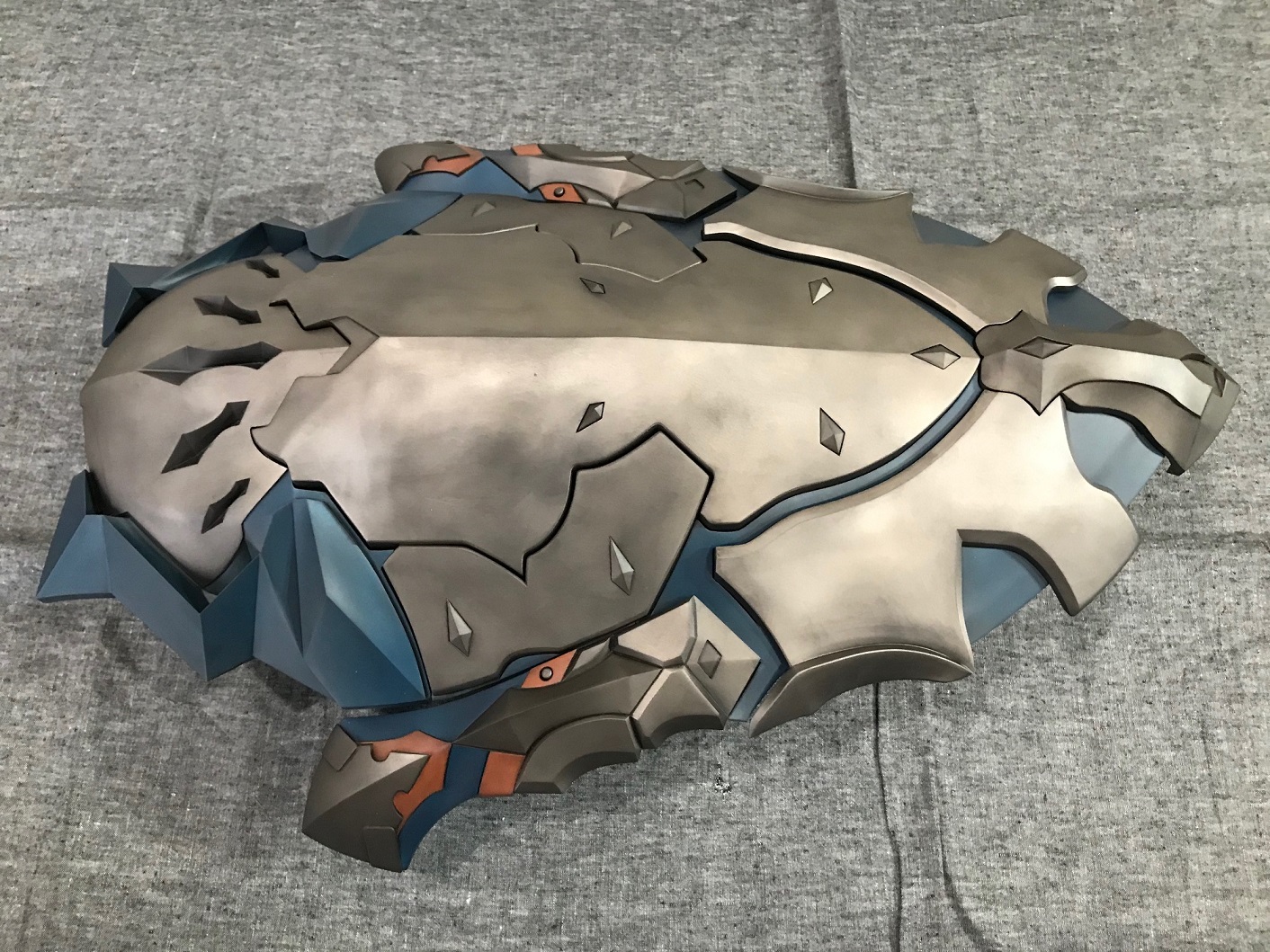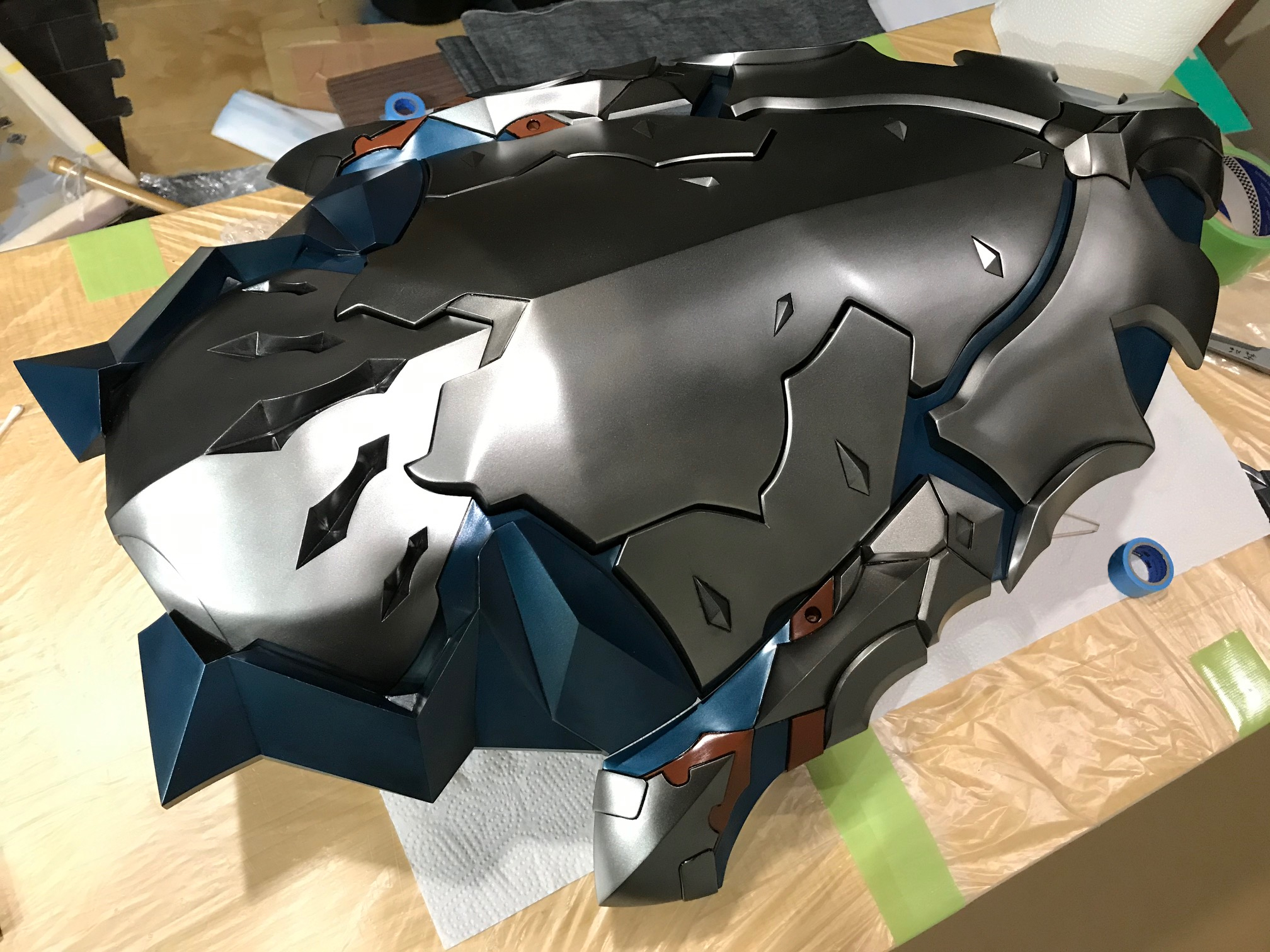 納得がいったところで塗装終了、各パーツの接着を開始します。 盾の真正面にくるパーツは盾をケースに収納し、本体をボルトで固定した後に被せて接着します。