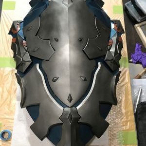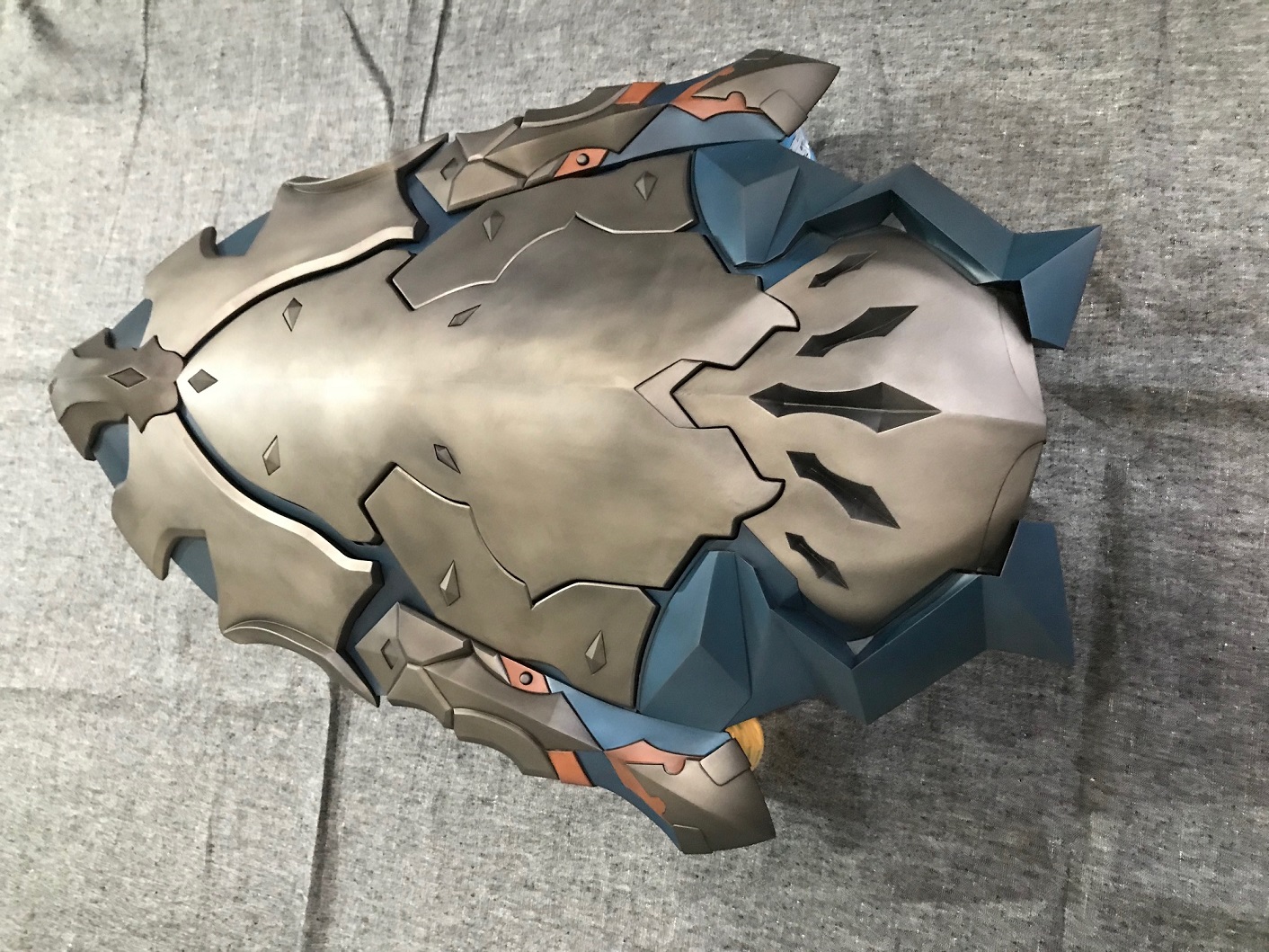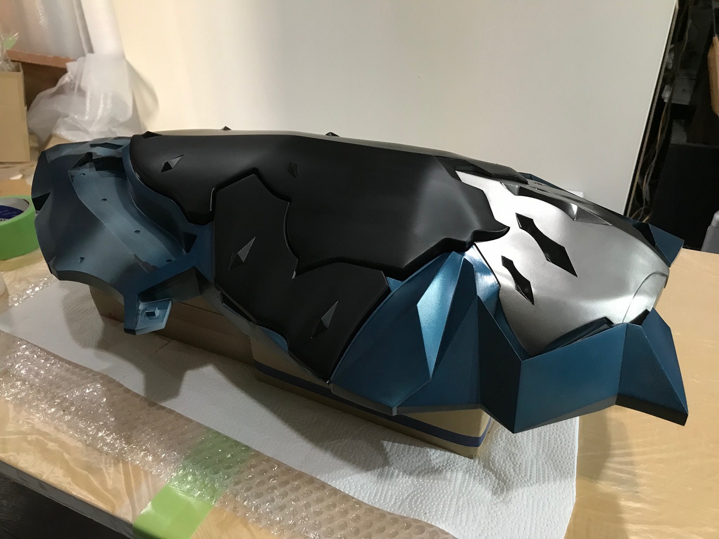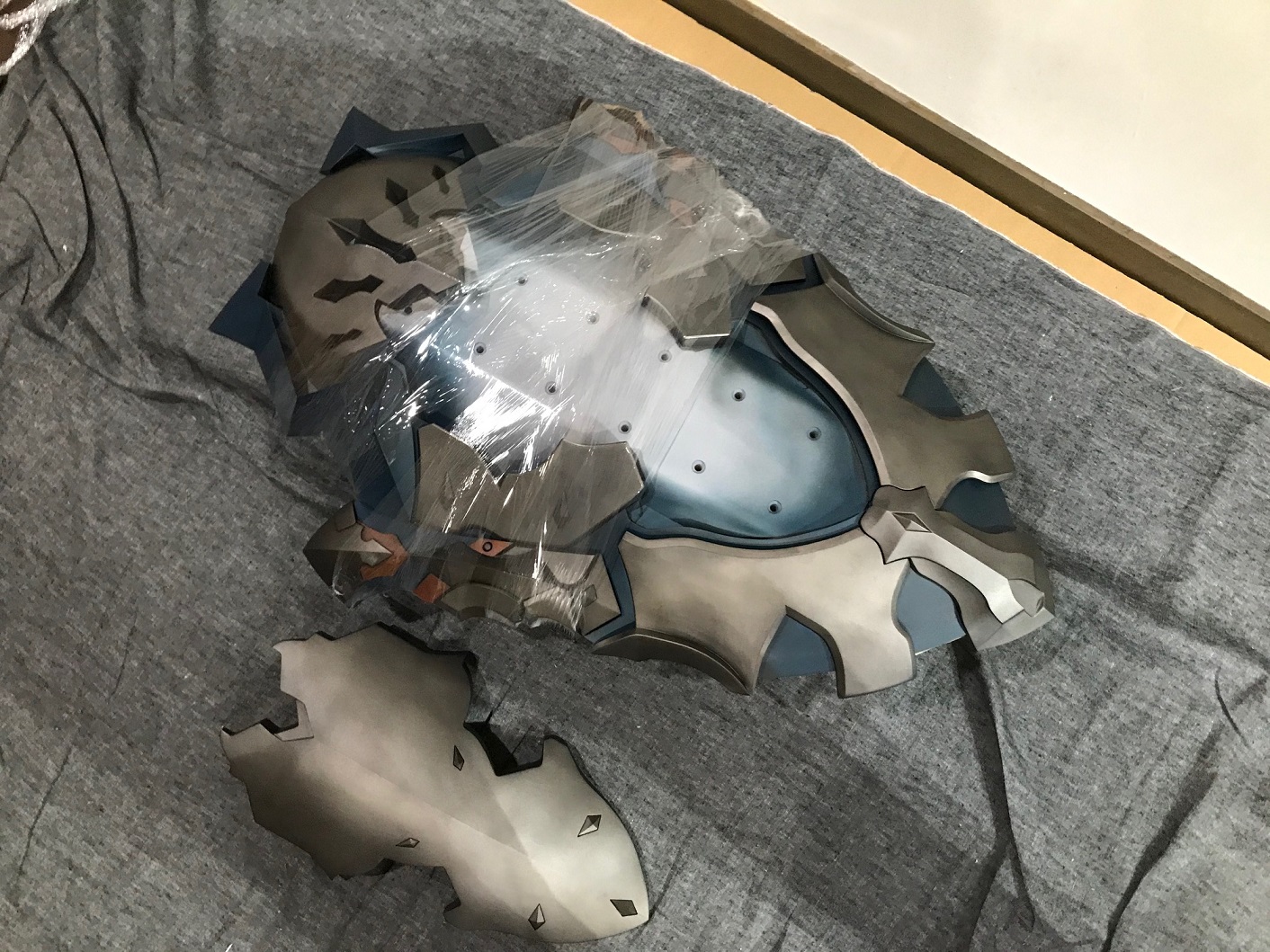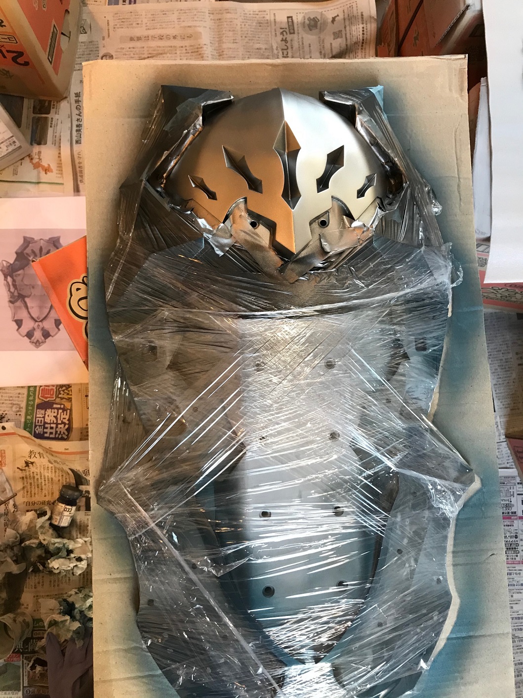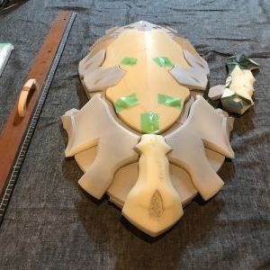 納得がいったところで塗装終了、各パーツの接着を開始します。 盾の真正面にくるパーツは盾をケースに収納し、本体をボルトで固定した後に被せて接着します。