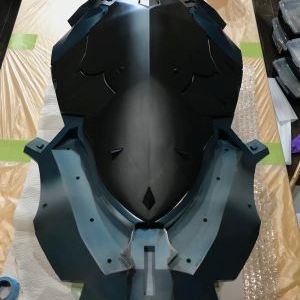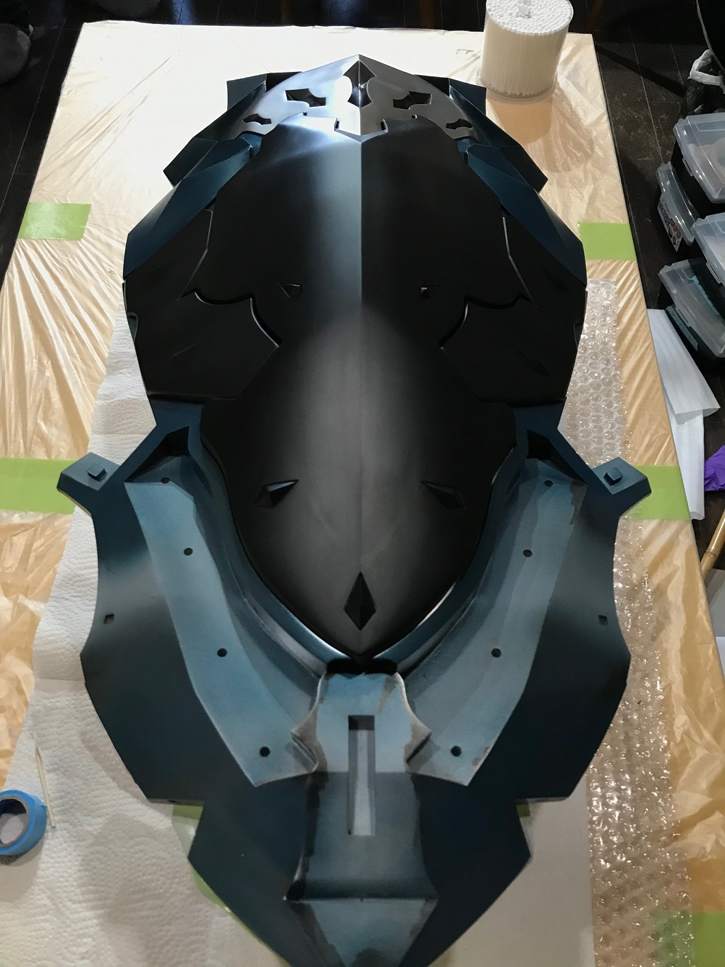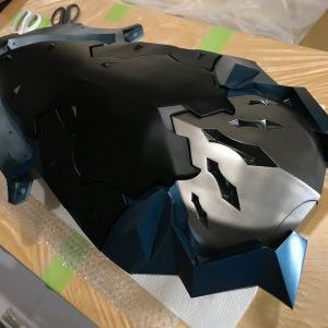 研磨完了後、下塗りし、各色ごとにマスキングしながら本塗装をおこなっていきます。