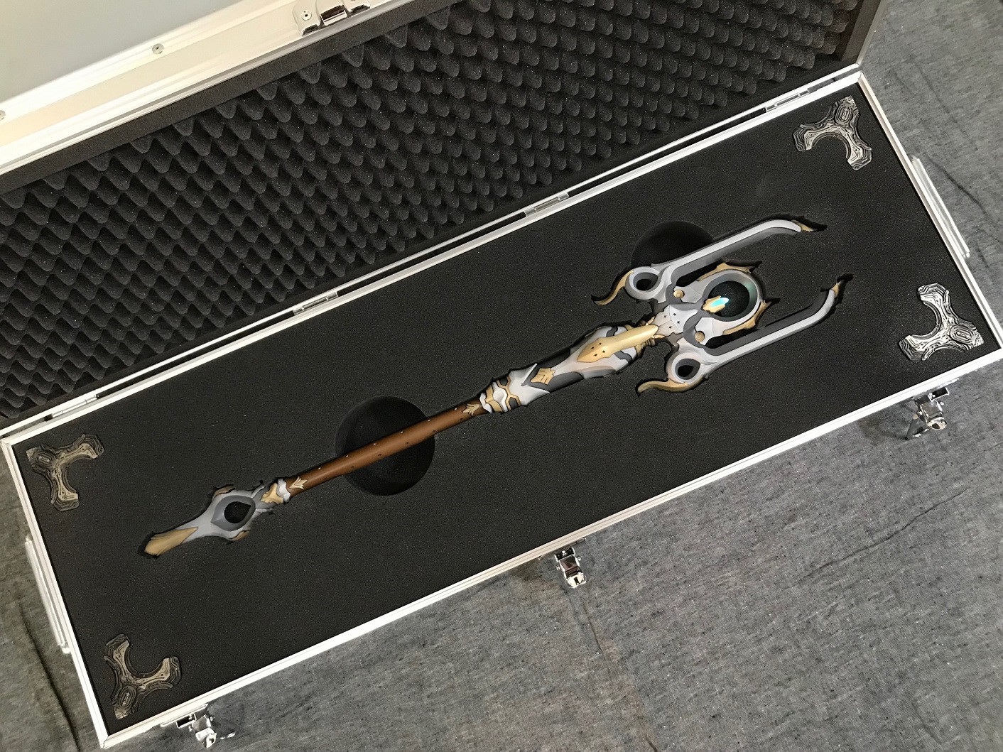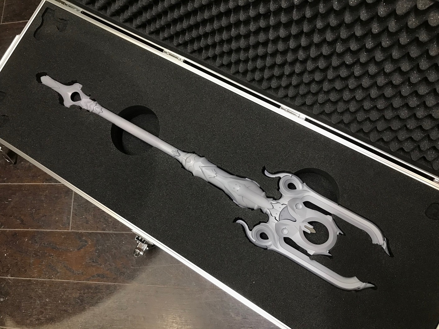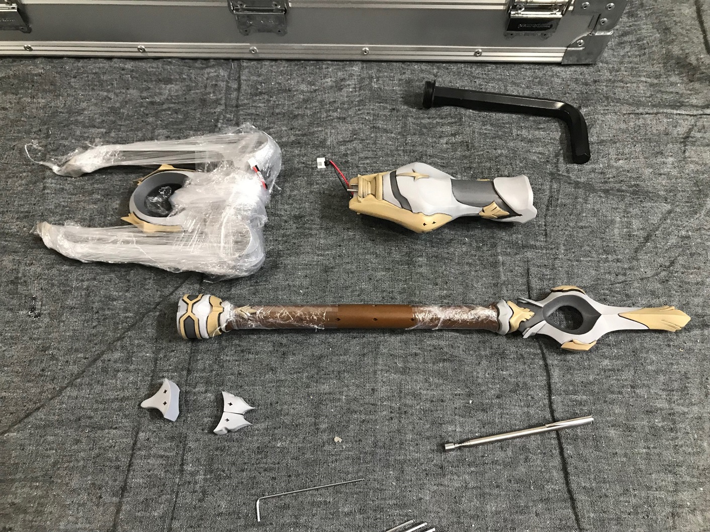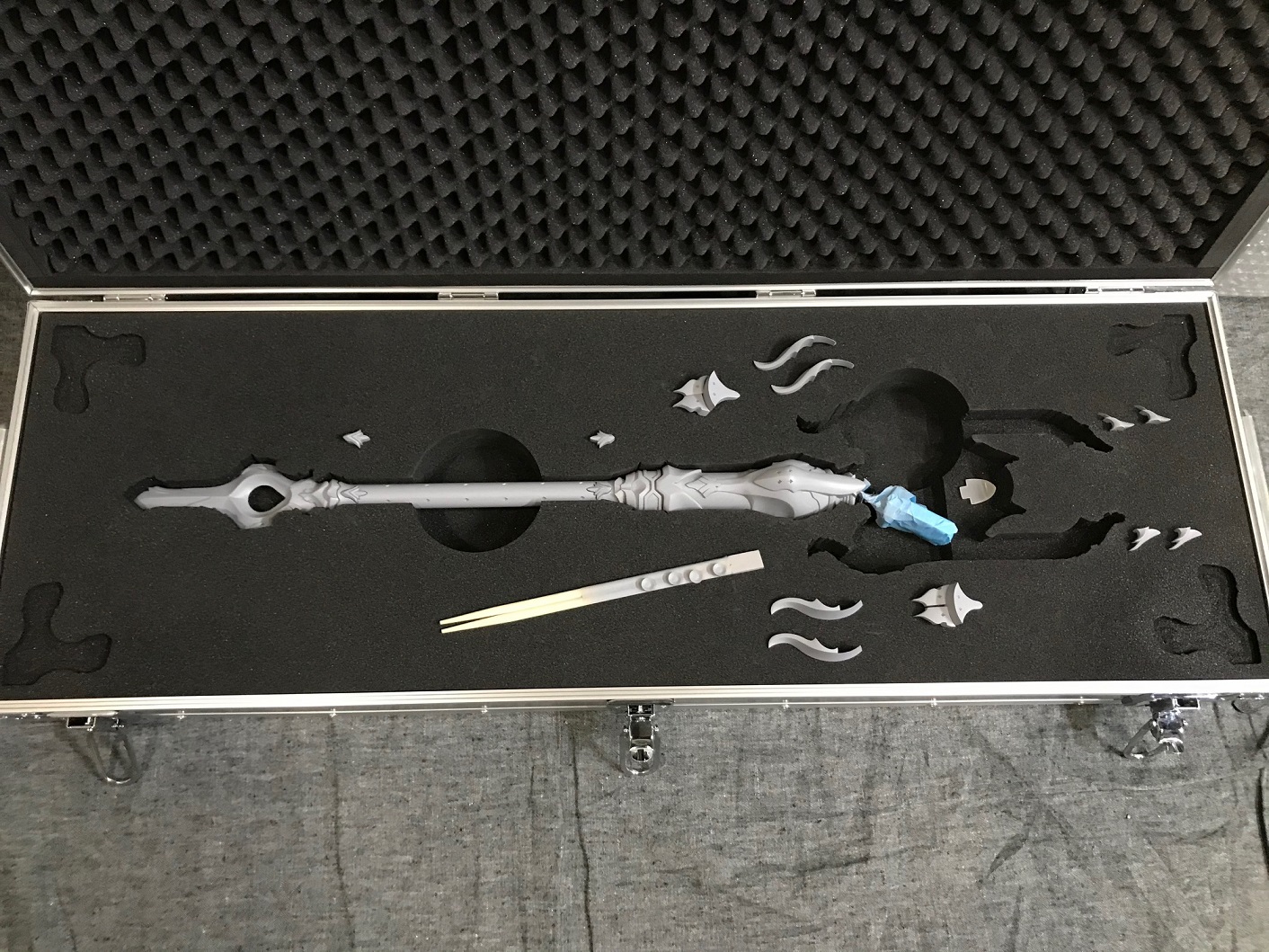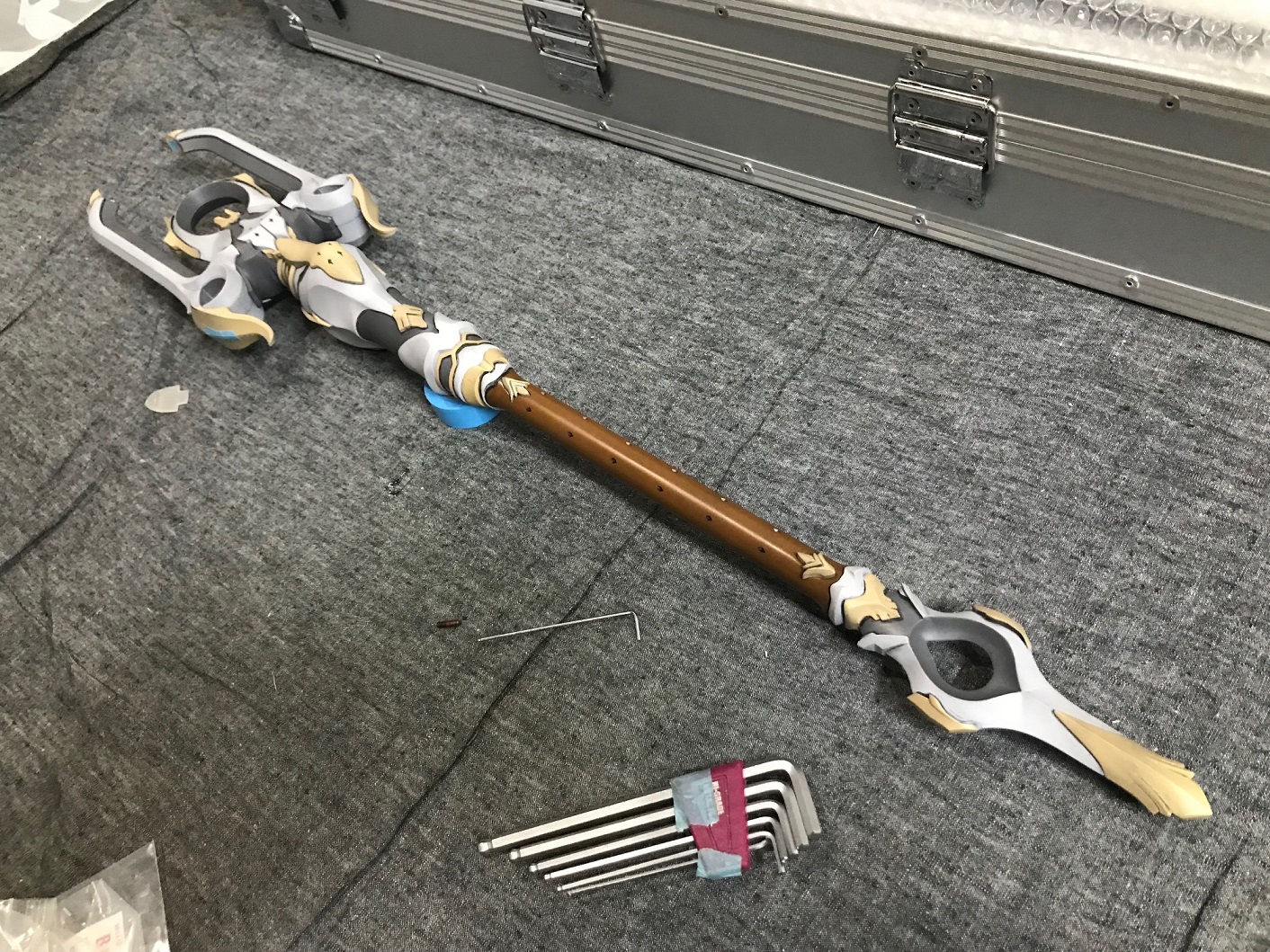 他武具と同じく提示頂いた資料を基に1/1にした際の見栄えを考慮しつつ、今回は下記の点を重視しました。 ・盾や弓のようにケースへ固定せず持てる ・華奢かつ繊細で流れるようなデザインイメージを崩さないように再現を目指す ・特に発光部分が目を引くデザインなので資料のイメージを反映させつつ肉眼で見た際にも綺麗に発光させる ・ネジやボルトはこのアイテムの雰囲気を損なうので極力見えないように、ヘッドと柄のジョイント部は磁石を使用
