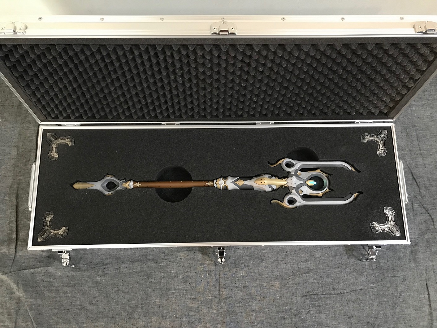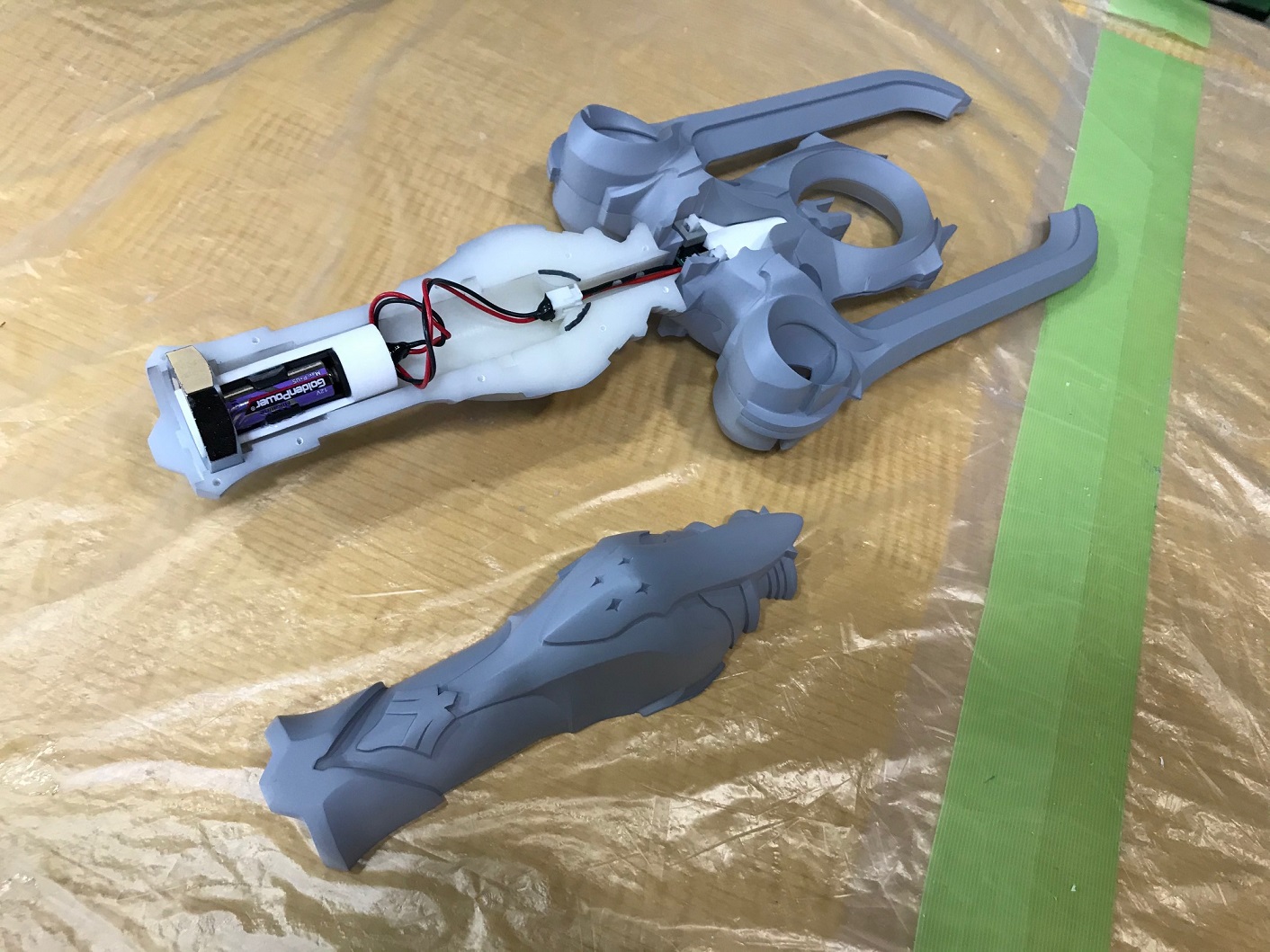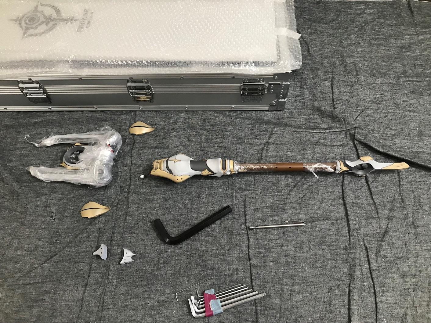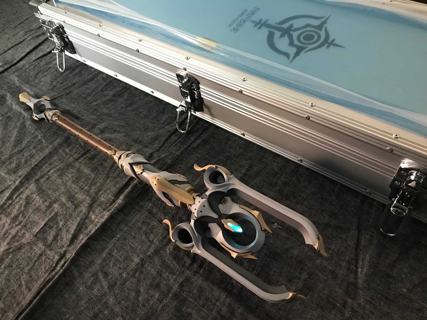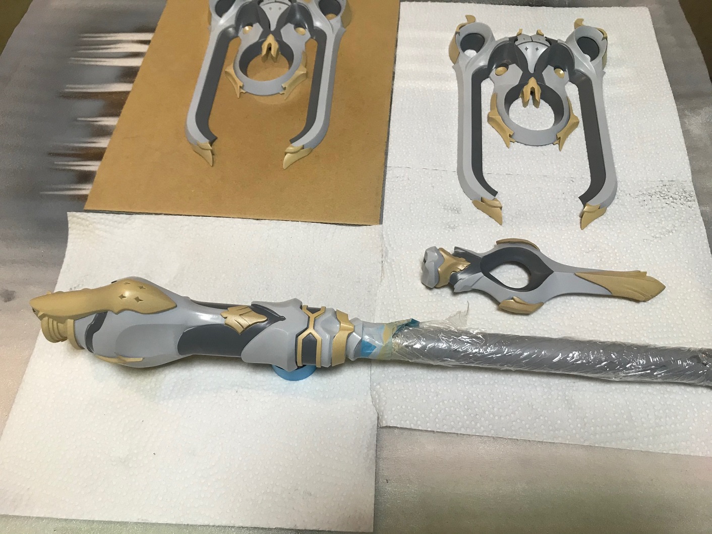 他武具と同じく提示頂いた資料を基に1/1にした際の見栄えを考慮しつつ、今回は下記の点を重視しました。 ・盾や弓のようにケースへ固定せず持てる ・華奢かつ繊細で流れるようなデザインイメージを崩さないように再現を目指す ・特に発光部分が目を引くデザインなので資料のイメージを反映させつつ肉眼で見た際にも綺麗に発光させる ・ネジやボルトはこのアイテムの雰囲気を損なうので極力見えないように、ヘッドと柄のジョイント部は磁石を使用