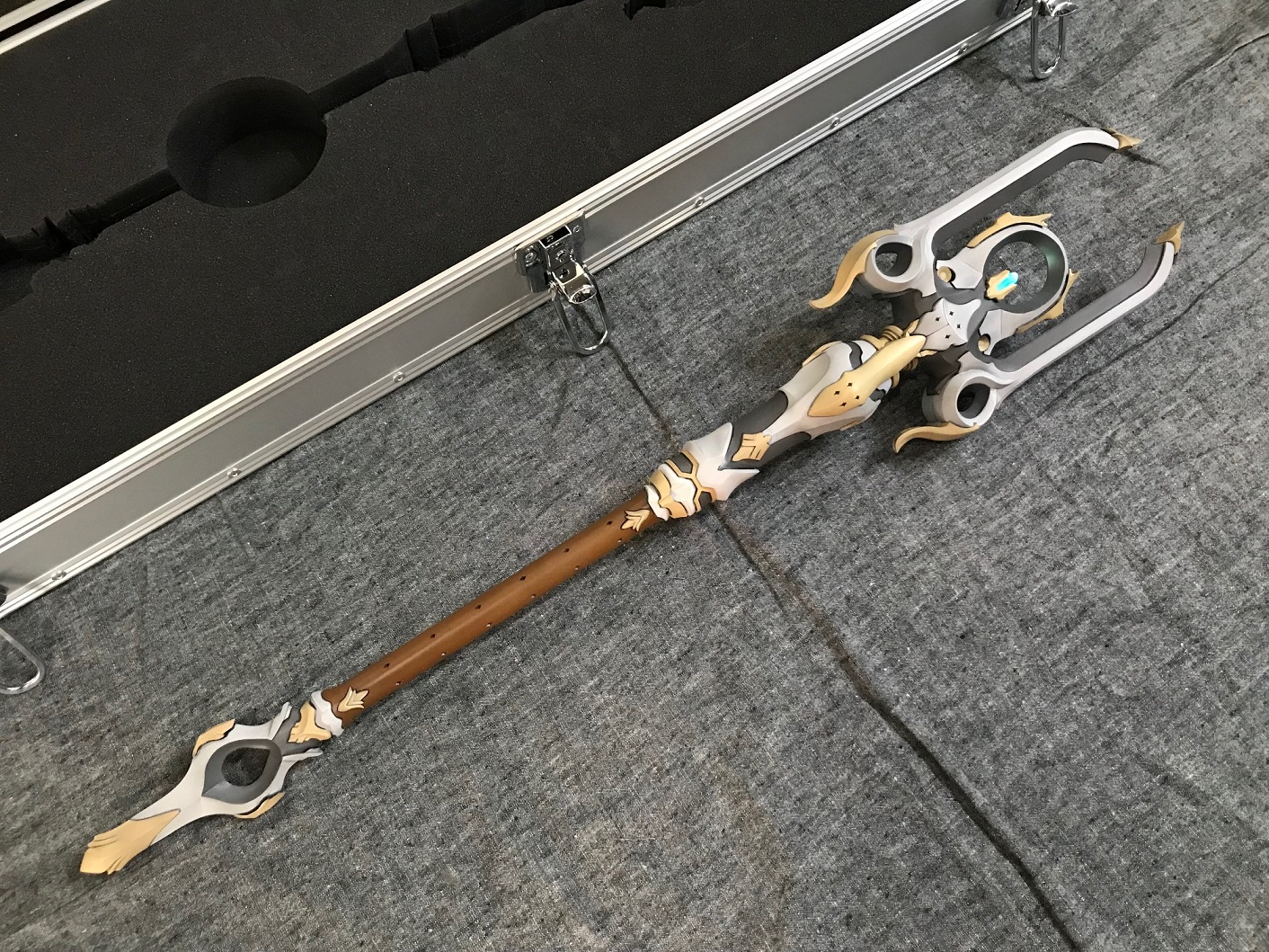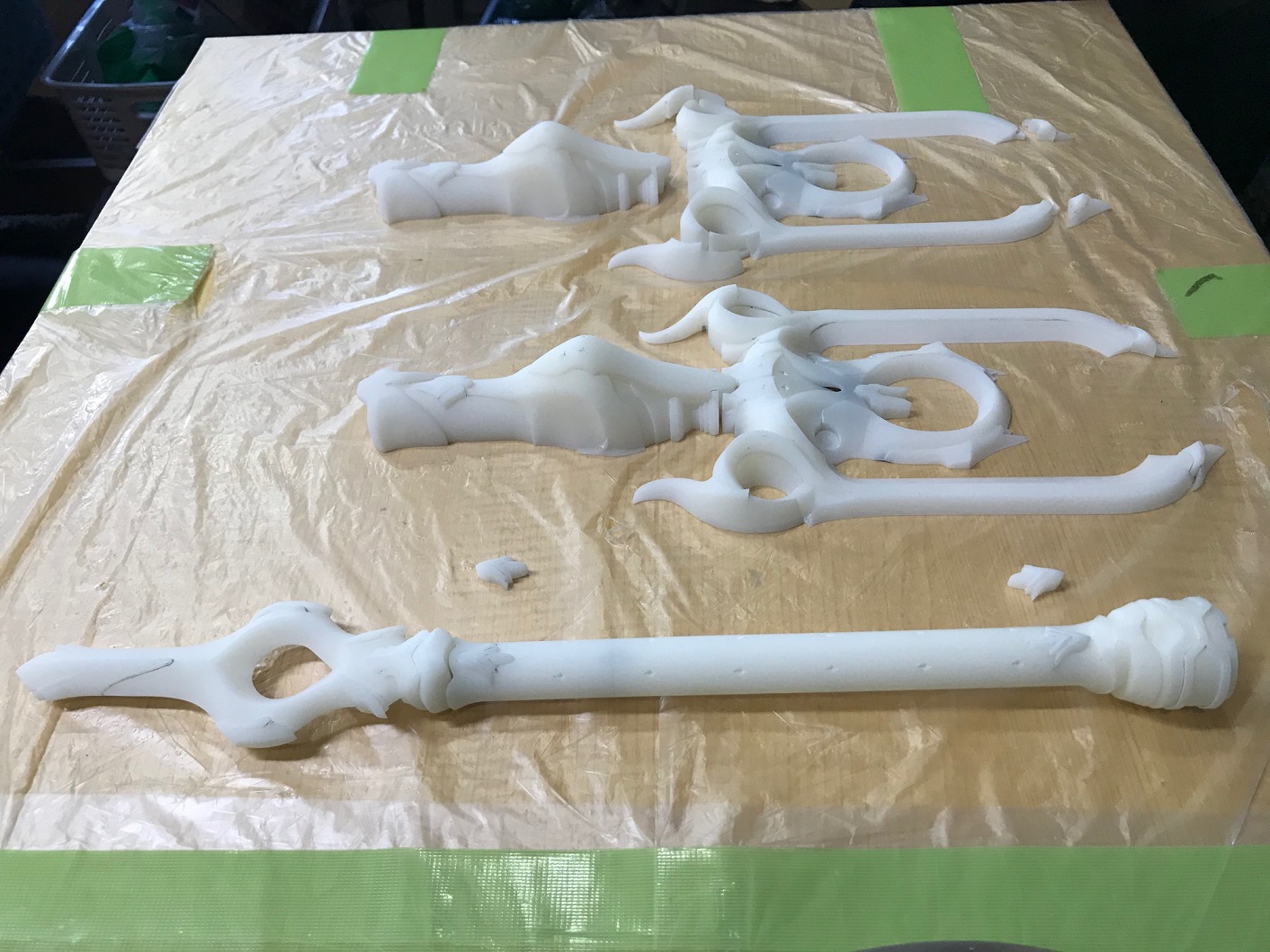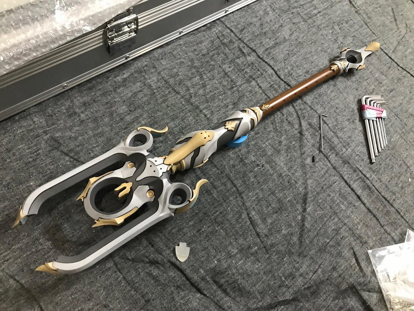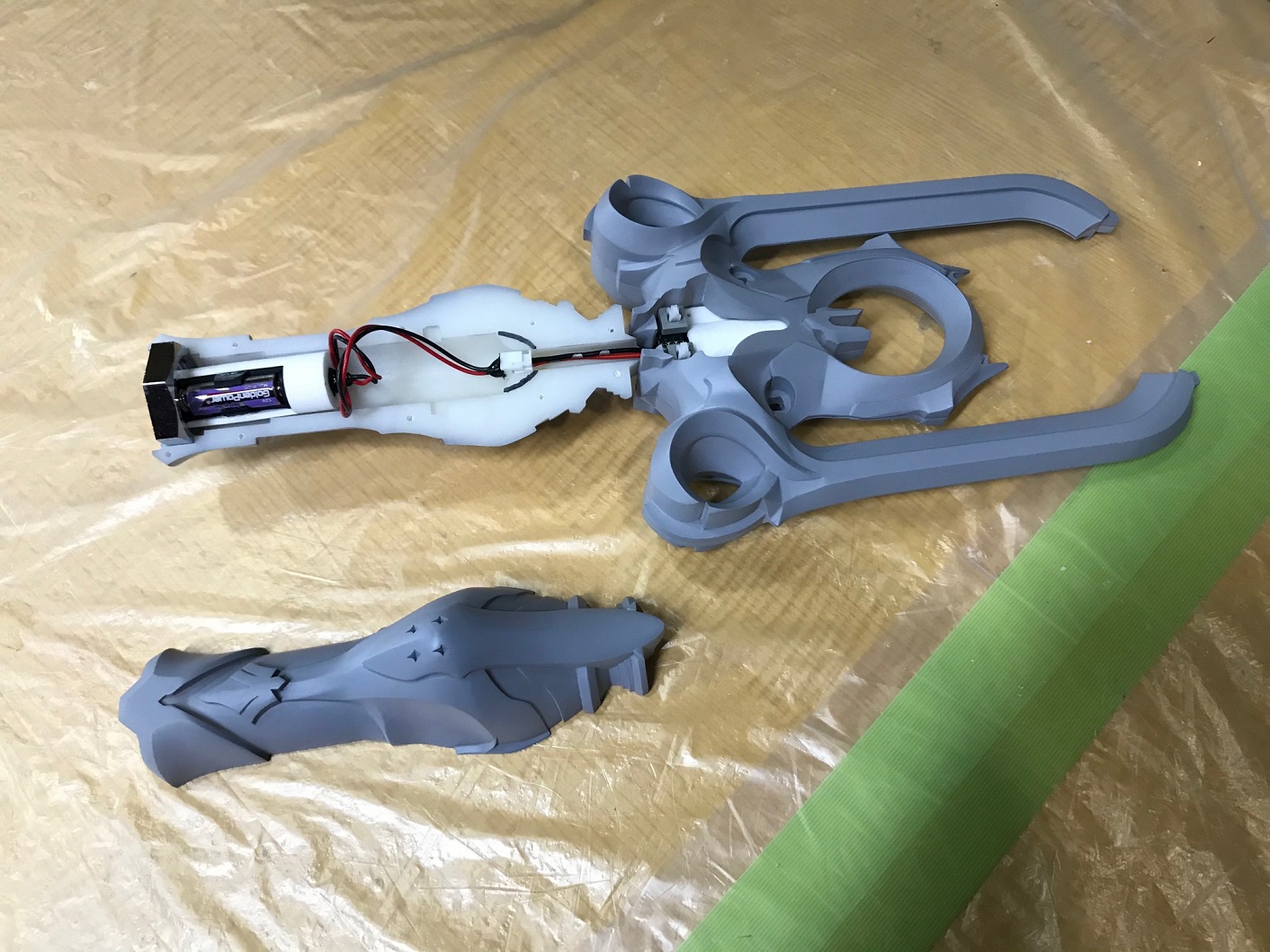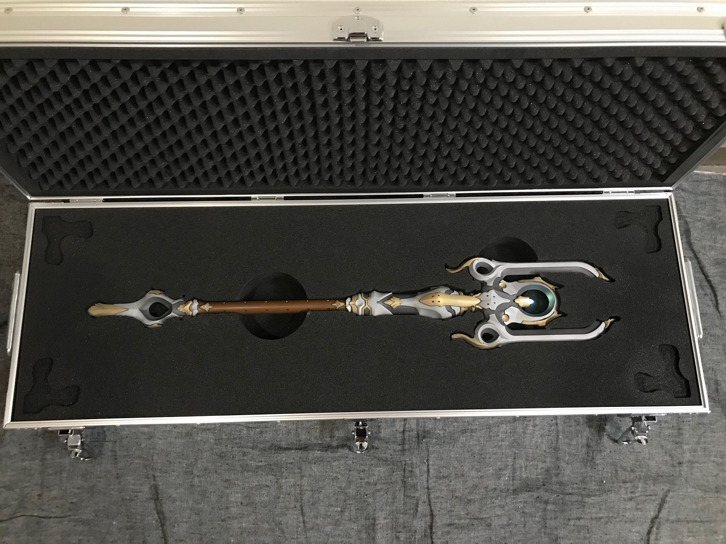 他武具と同じく提示頂いた資料を基に1/1にした際の見栄えを考慮しつつ、今回は下記の点を重視しました。 ・盾や弓のようにケースへ固定せず持てる ・華奢かつ繊細で流れるようなデザインイメージを崩さないように再現を目指す ・特に発光部分が目を引くデザインなので資料のイメージを反映させつつ肉眼で見た際にも綺麗に発光させる ・ネジやボルトはこのアイテムの雰囲気を損なうので極力見えないように、ヘッドと柄のジョイント部は磁石を使用