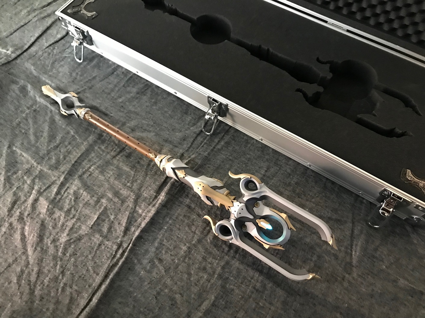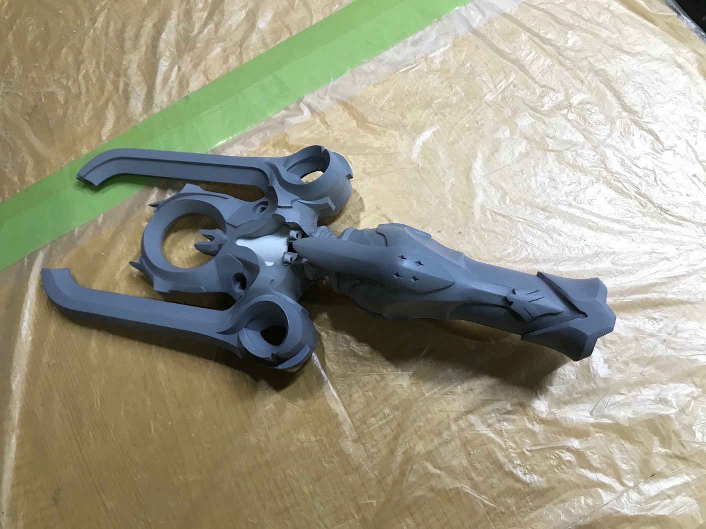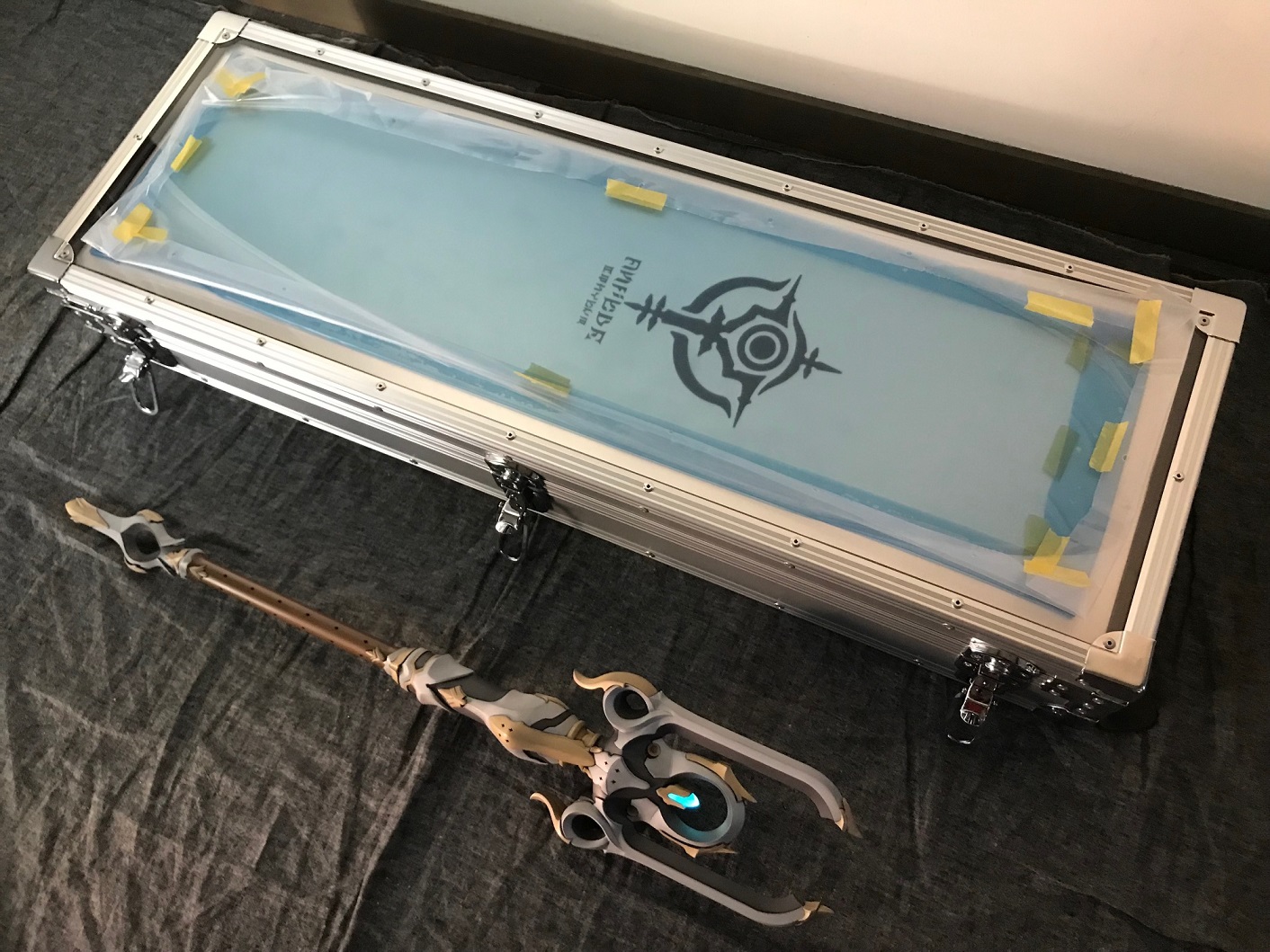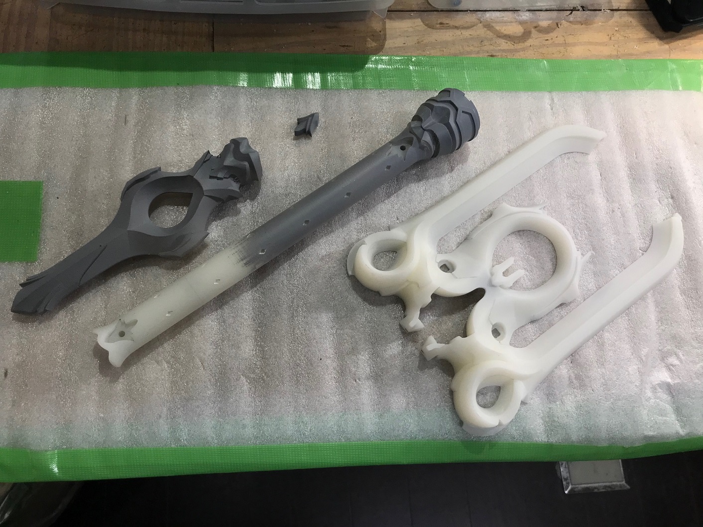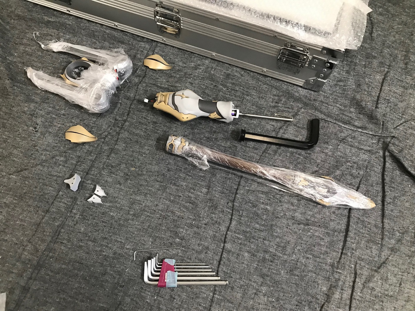 他武具と同じく提示頂いた資料を基に1/1にした際の見栄えを考慮しつつ、今回は下記の点を重視しました。 ・盾や弓のようにケースへ固定せず持てる ・華奢かつ繊細で流れるようなデザインイメージを崩さないように再現を目指す ・特に発光部分が目を引くデザインなので資料のイメージを反映させつつ肉眼で見た際にも綺麗に発光させる ・ネジやボルトはこのアイテムの雰囲気を損なうので極力見えないように、ヘッドと柄のジョイント部は磁石を使用