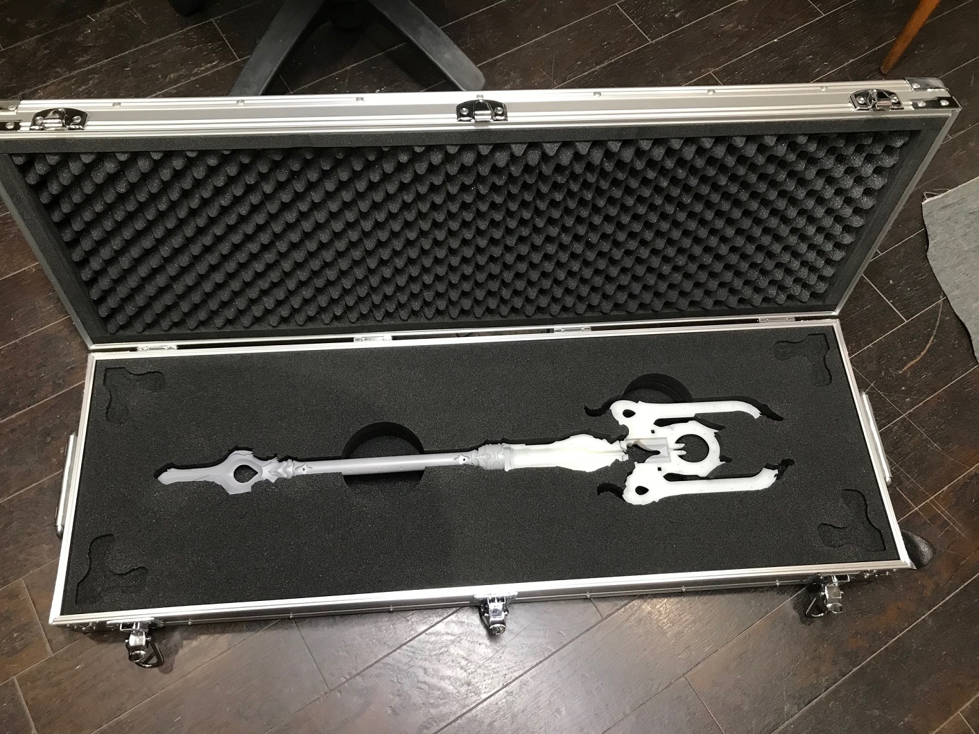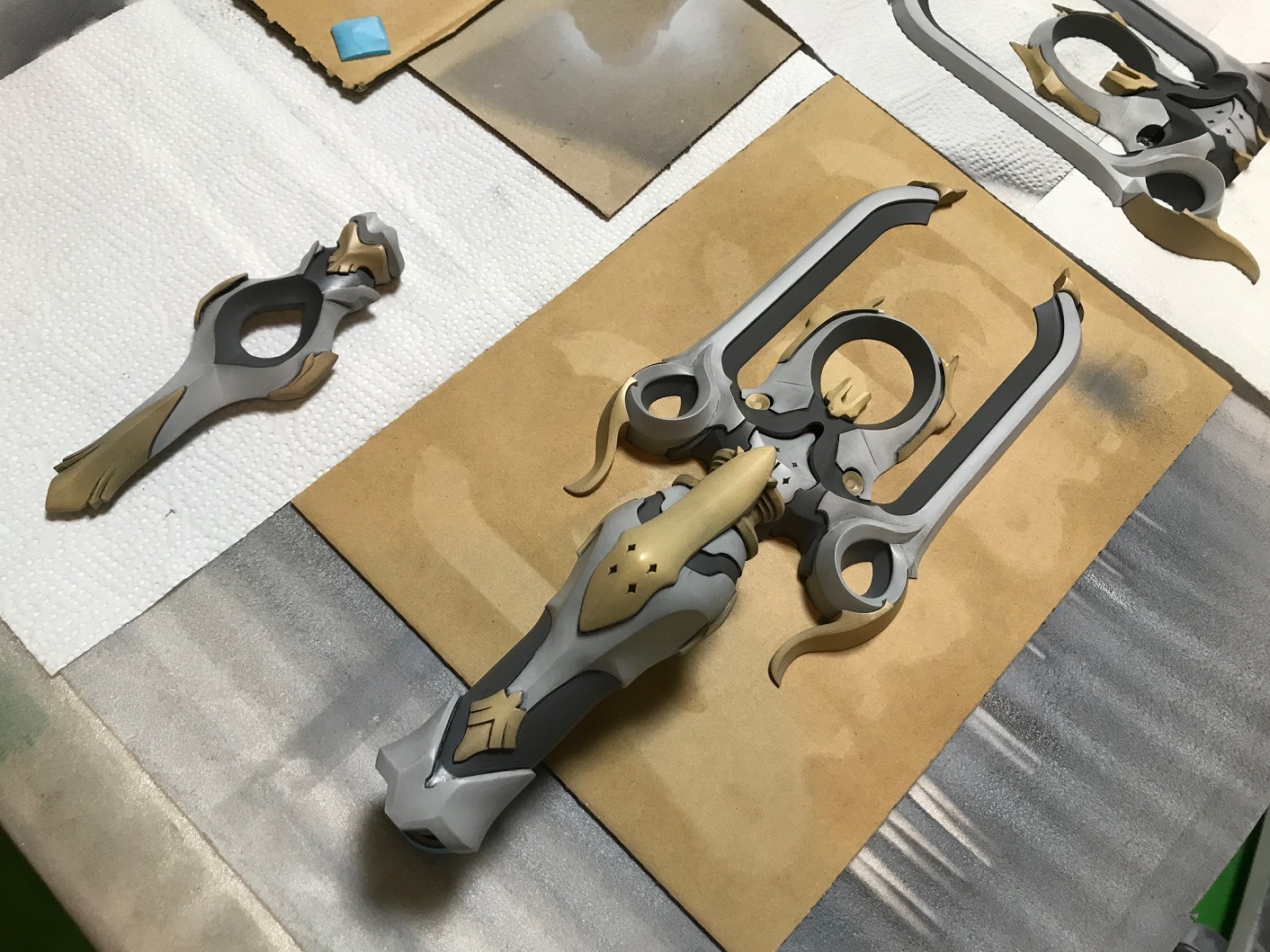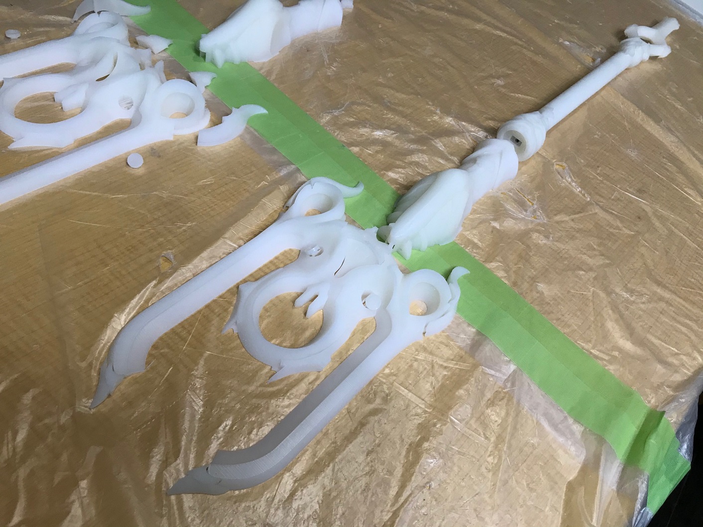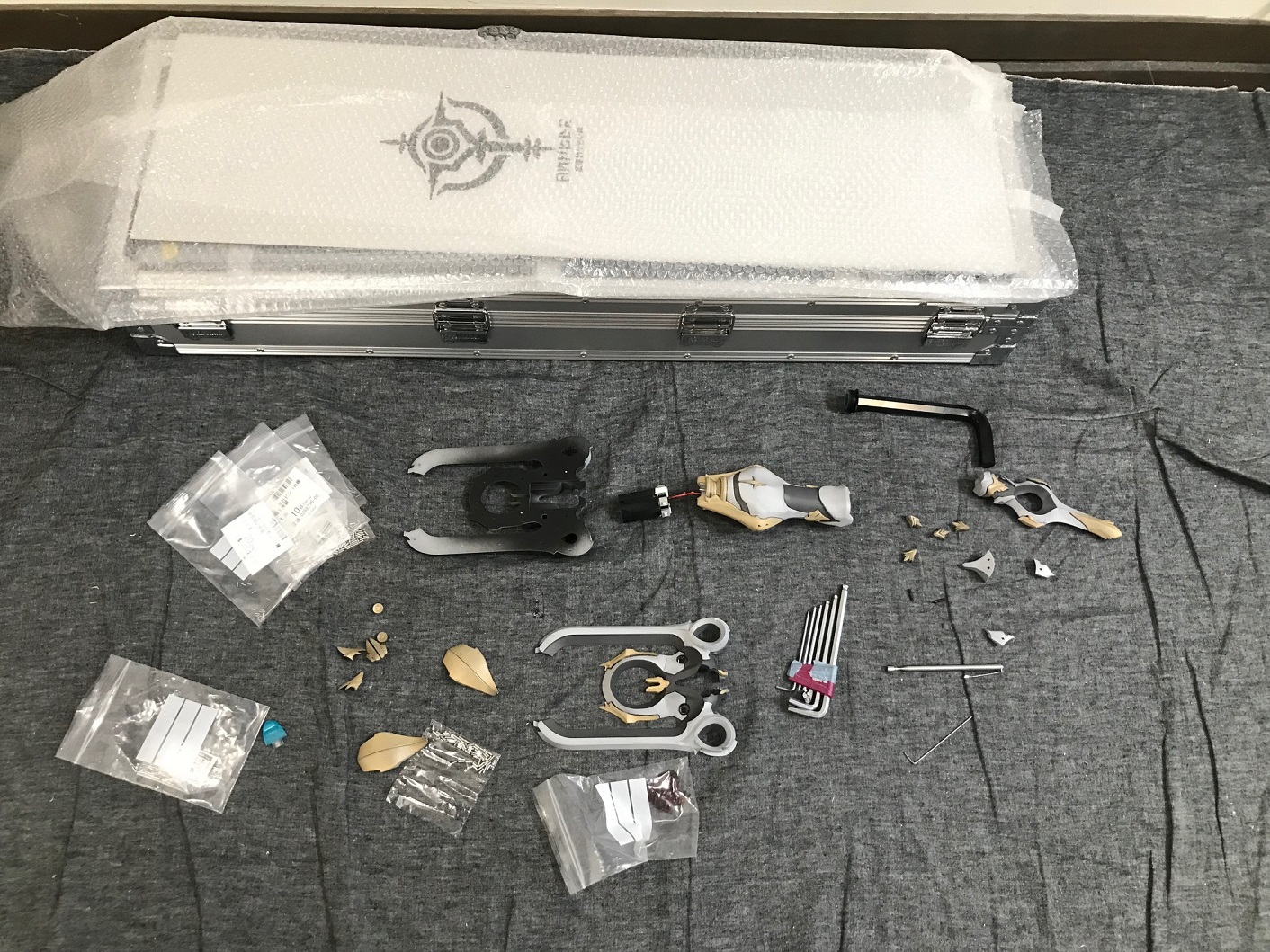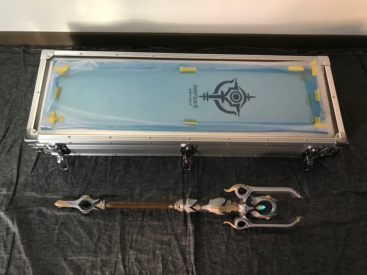 他武具と同じく提示頂いた資料を基に1/1にした際の見栄えを考慮しつつ、今回は下記の点を重視しました。 ・盾や弓のようにケースへ固定せず持てる ・華奢かつ繊細で流れるようなデザインイメージを崩さないように再現を目指す ・特に発光部分が目を引くデザインなので資料のイメージを反映させつつ肉眼で見た際にも綺麗に発光させる ・ネジやボルトはこのアイテムの雰囲気を損なうので極力見えないように、ヘッドと柄のジョイント部は磁石を使用