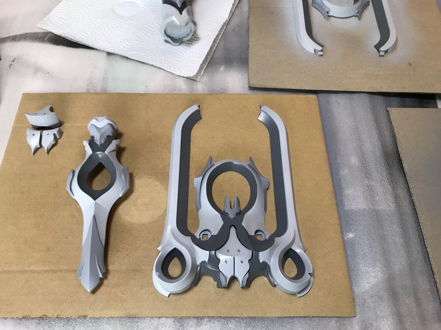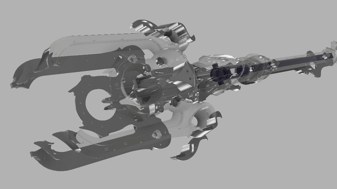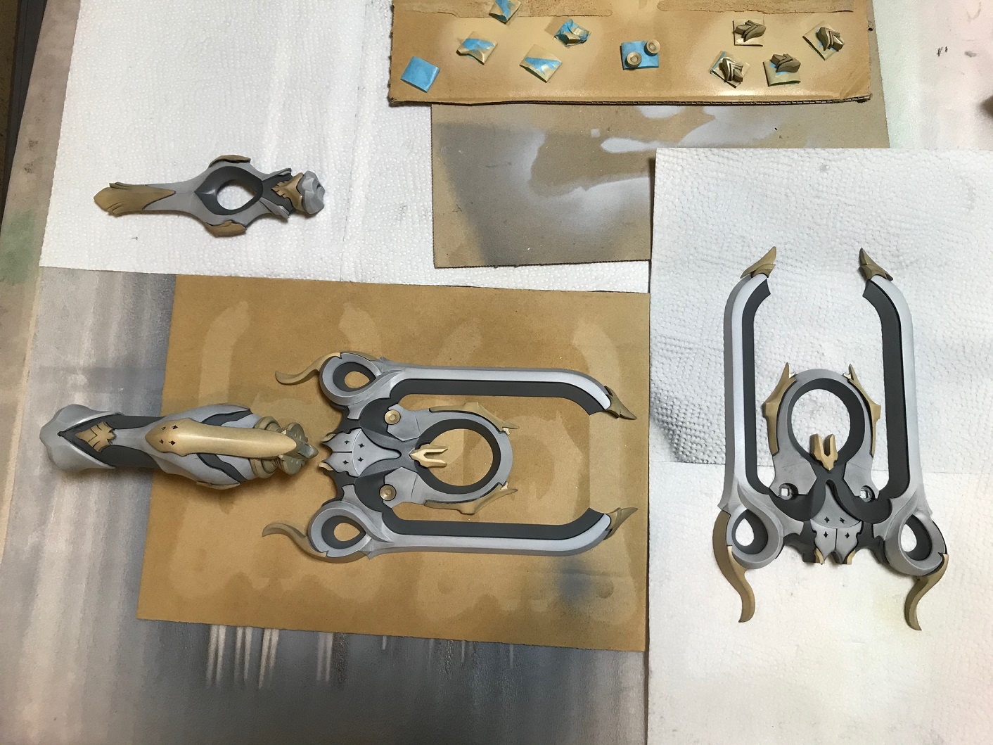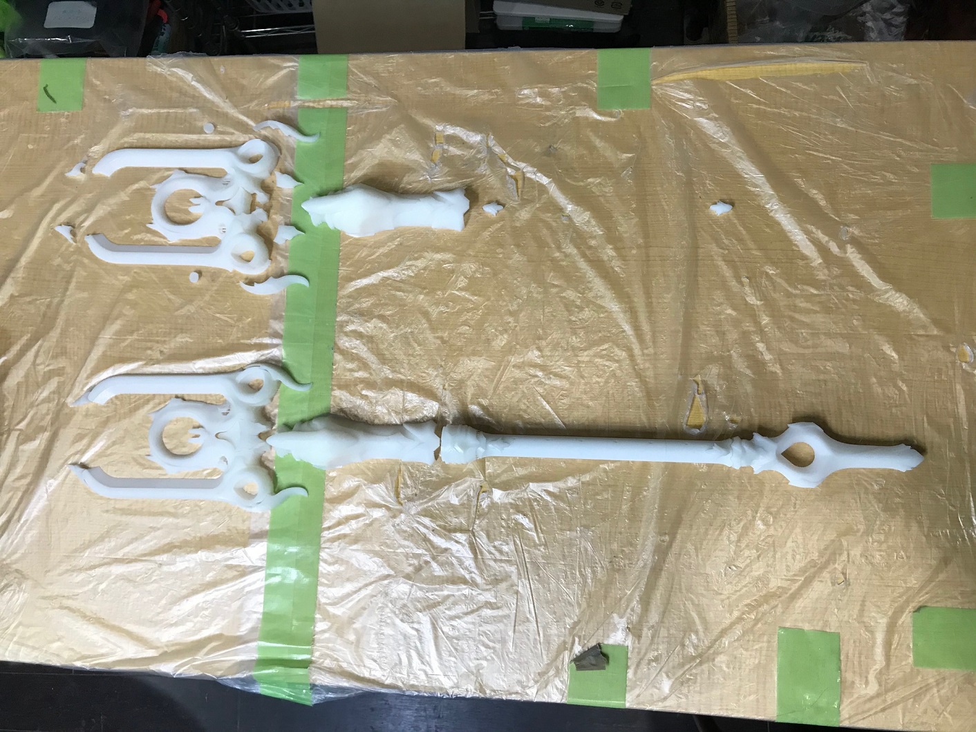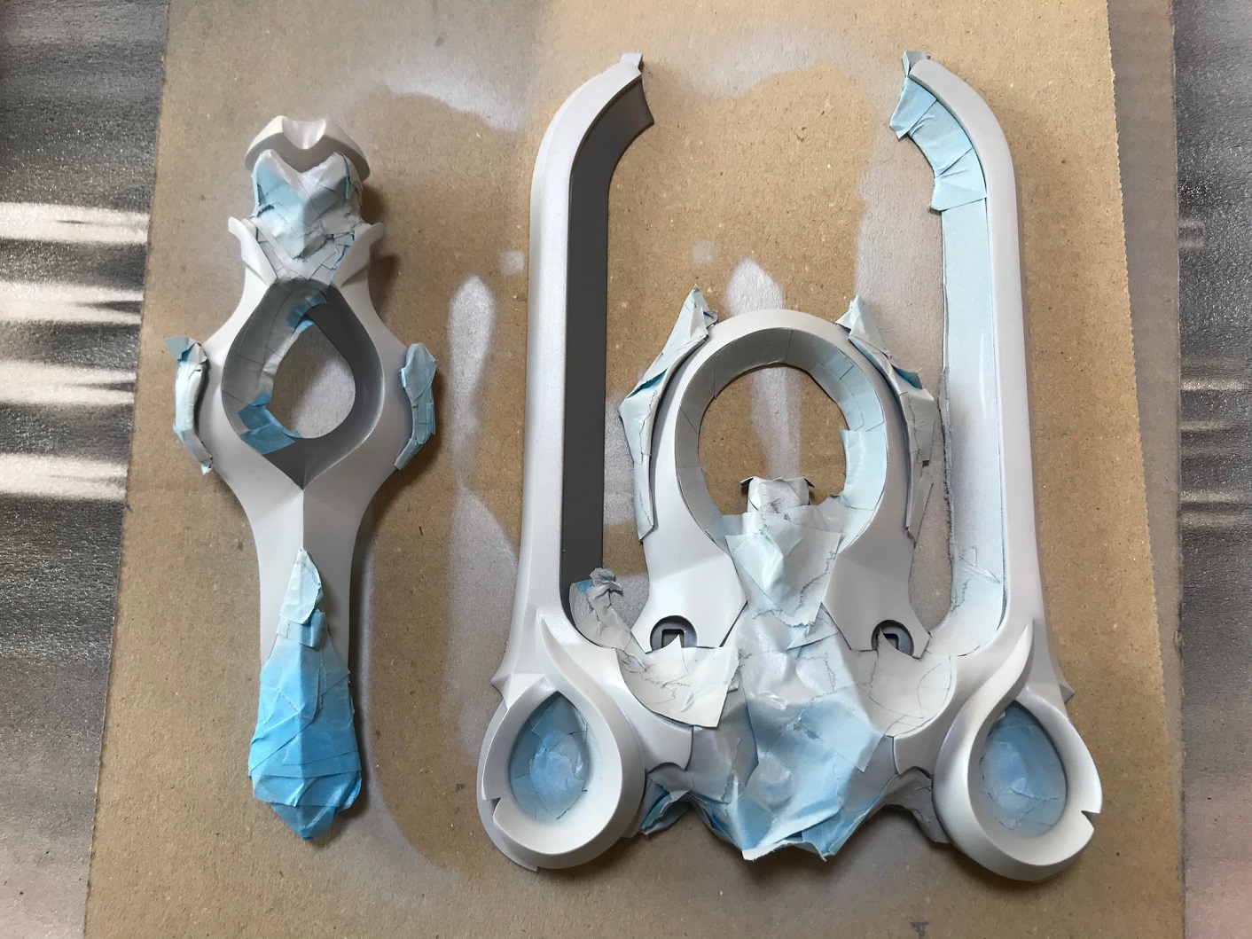 他武具と同じく提示頂いた資料を基に1/1にした際の見栄えを考慮しつつ、今回は下記の点を重視しました。 ・盾や弓のようにケースへ固定せず持てる ・華奢かつ繊細で流れるようなデザインイメージを崩さないように再現を目指す ・特に発光部分が目を引くデザインなので資料のイメージを反映させつつ肉眼で見た際にも綺麗に発光させる ・ネジやボルトはこのアイテムの雰囲気を損なうので極力見えないように、ヘッドと柄のジョイント部は磁石を使用