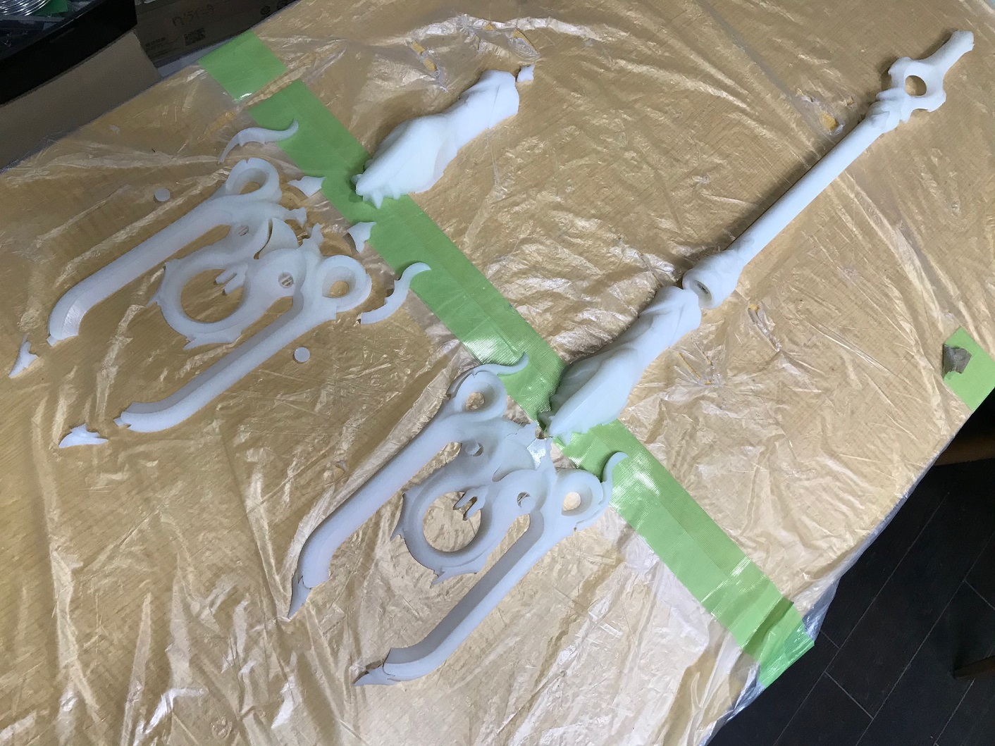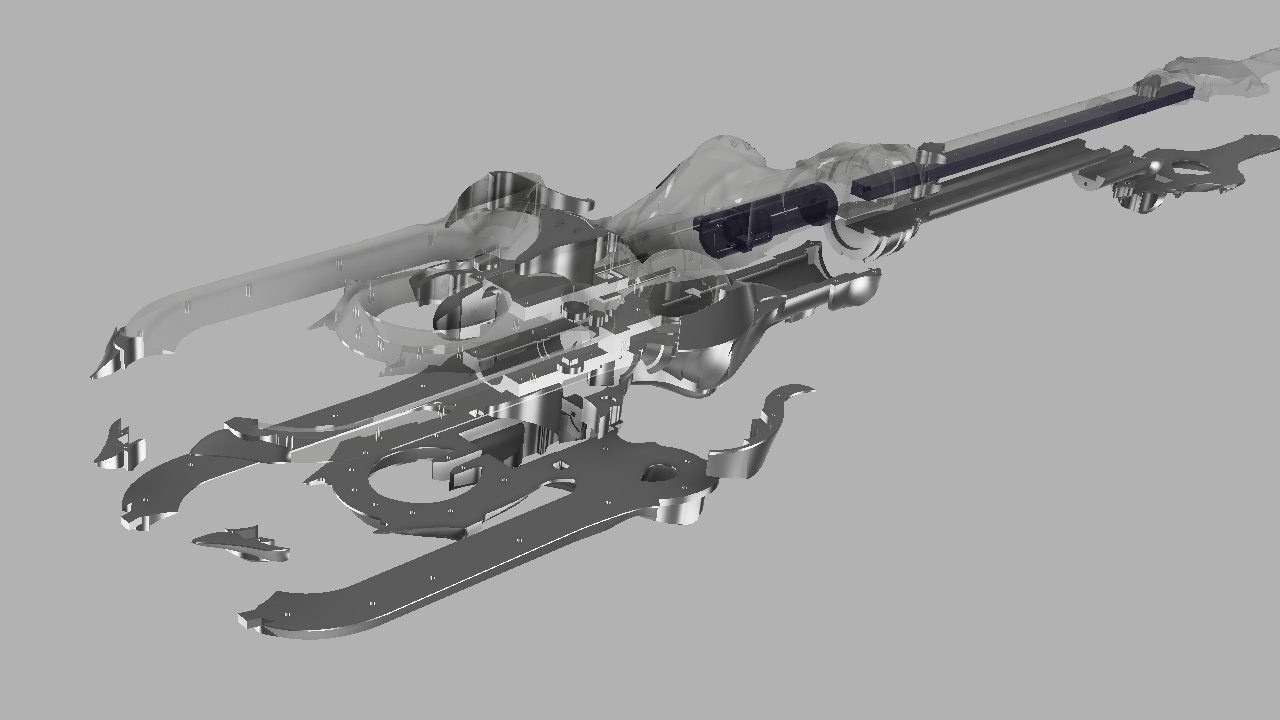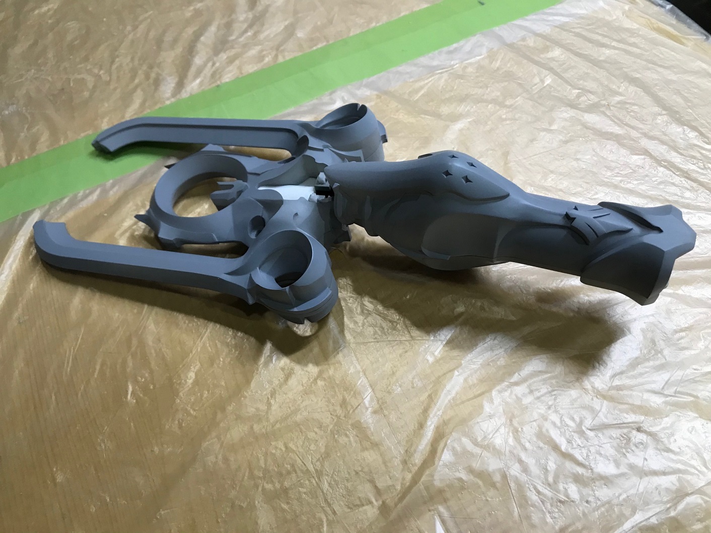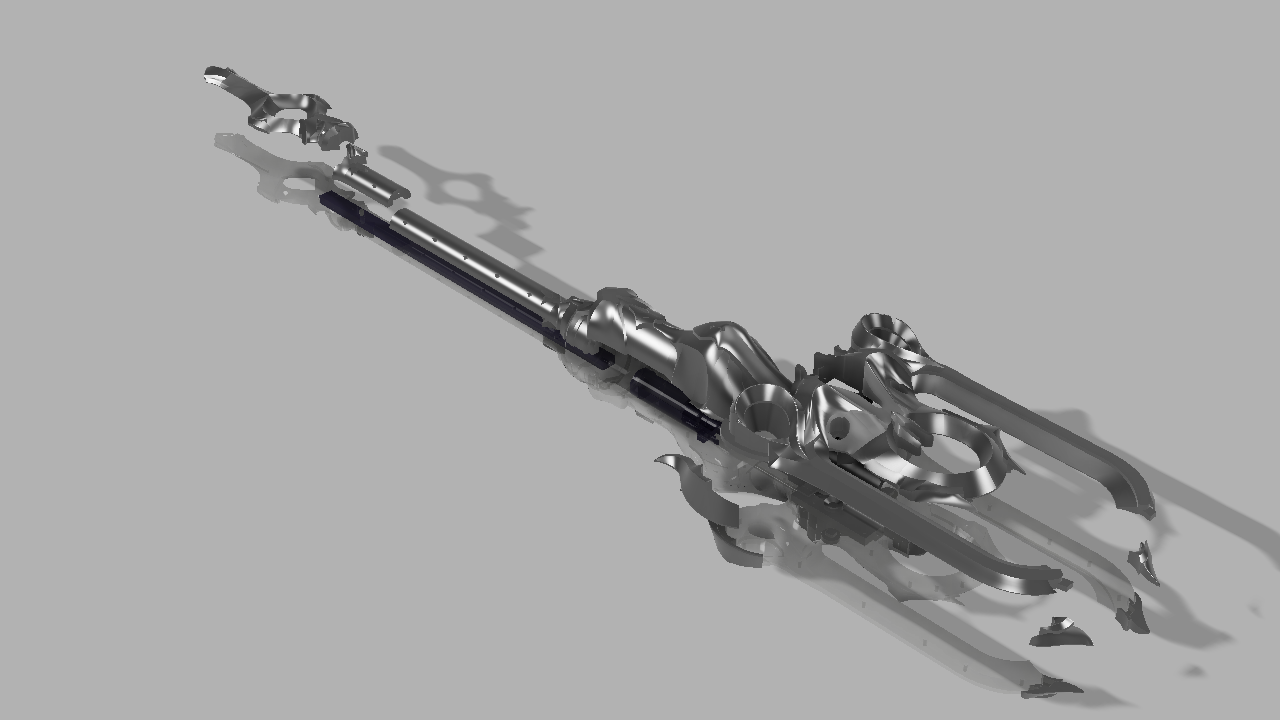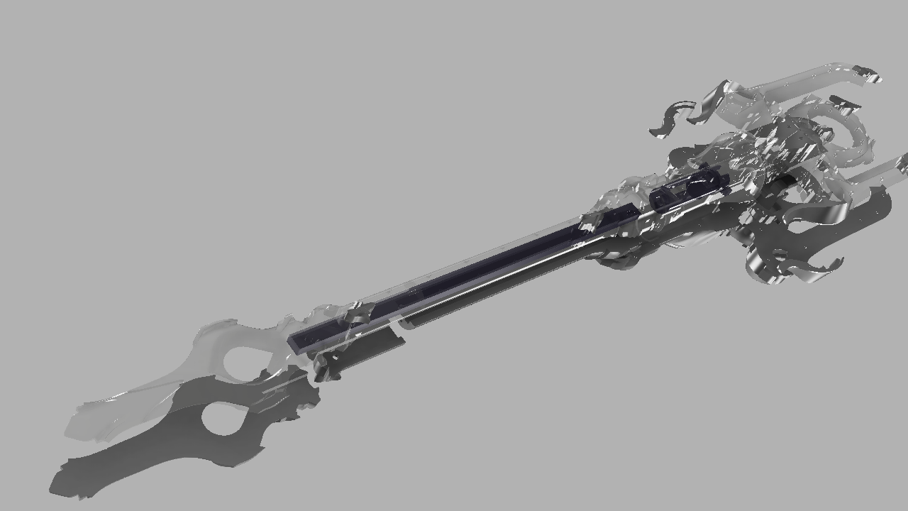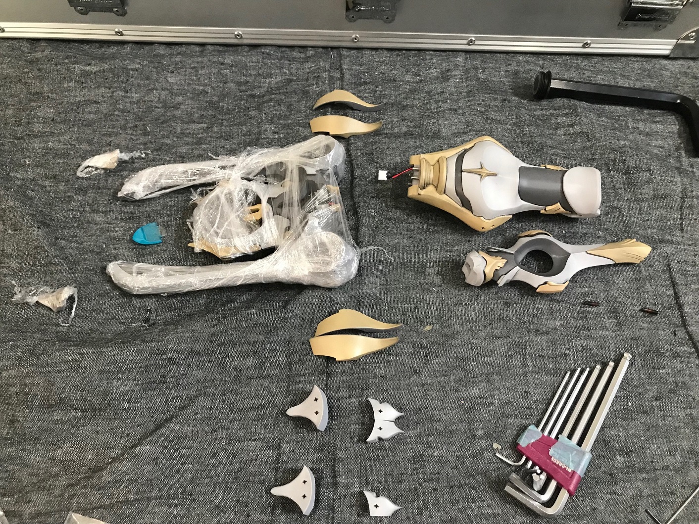 他武具と同じく提示頂いた資料を基に1/1にした際の見栄えを考慮しつつ、今回は下記の点を重視しました。 ・盾や弓のようにケースへ固定せず持てる ・華奢かつ繊細で流れるようなデザインイメージを崩さないように再現を目指す ・特に発光部分が目を引くデザインなので資料のイメージを反映させつつ肉眼で見た際にも綺麗に発光させる ・ネジやボルトはこのアイテムの雰囲気を損なうので極力見えないように、ヘッドと柄のジョイント部は磁石を使用