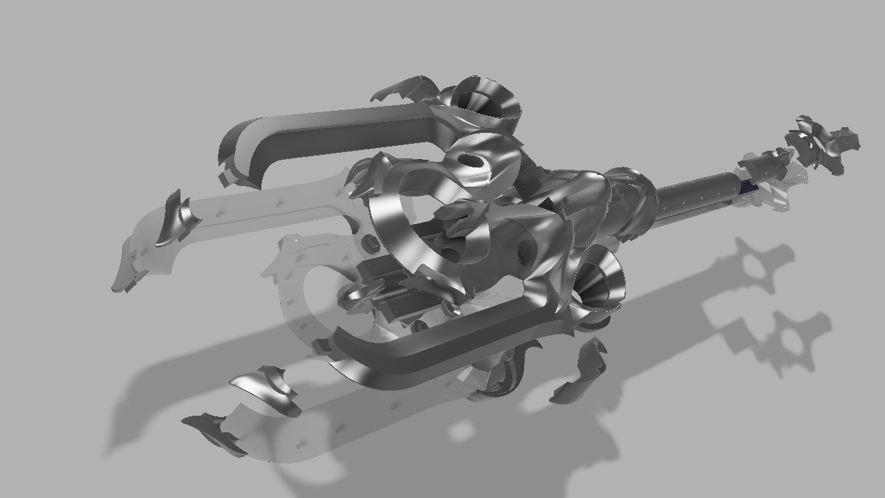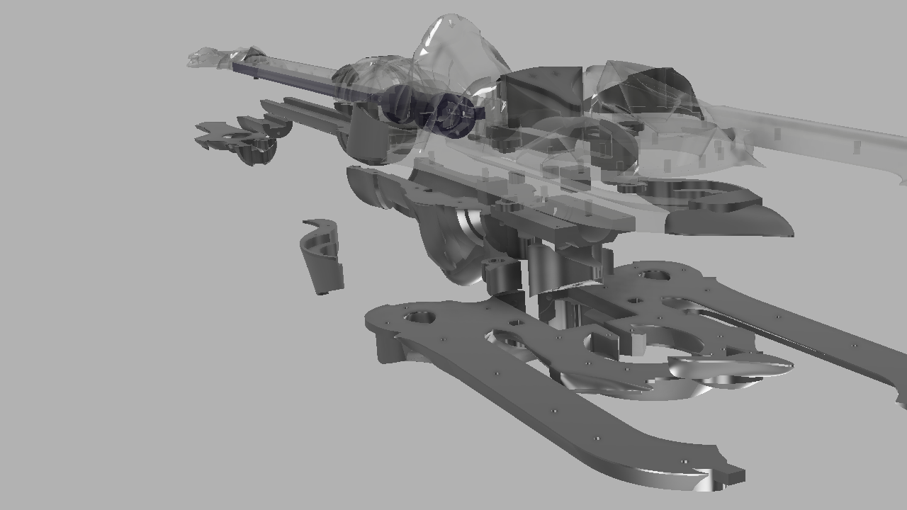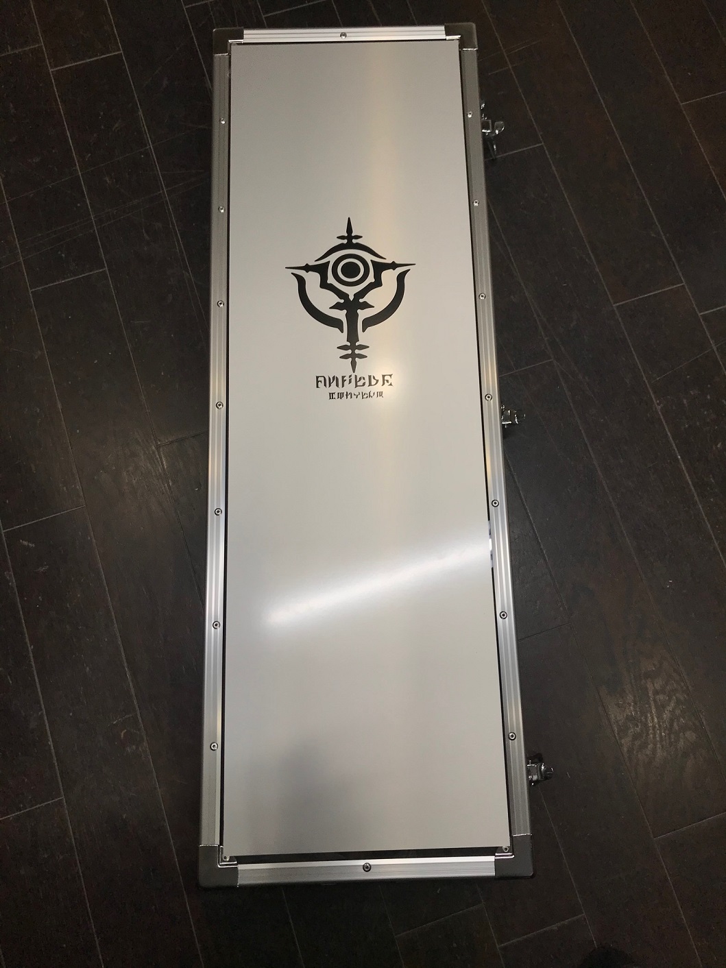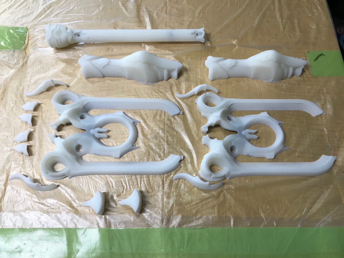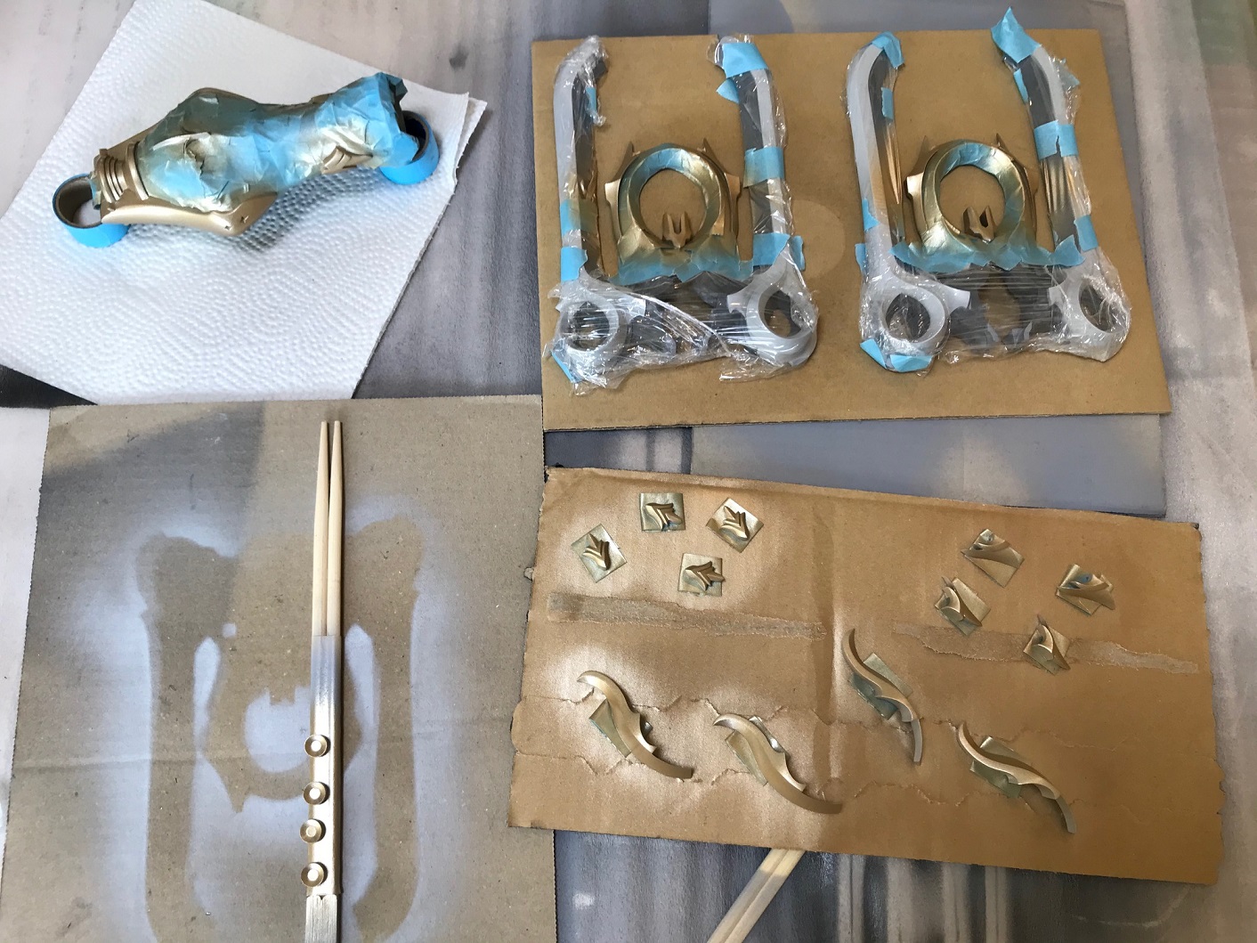 他武具と同じく提示頂いた資料を基に1/1にした際の見栄えを考慮しつつ、今回は下記の点を重視しました。 ・盾や弓のようにケースへ固定せず持てる ・華奢かつ繊細で流れるようなデザインイメージを崩さないように再現を目指す ・特に発光部分が目を引くデザインなので資料のイメージを反映させつつ肉眼で見た際にも綺麗に発光させる ・ネジやボルトはこのアイテムの雰囲気を損なうので極力見えないように、ヘッドと柄のジョイント部は磁石を使用